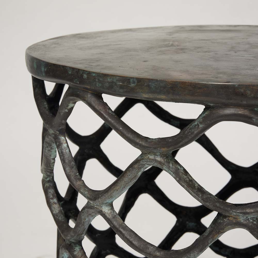 The bronze Lattice Accent Table in a verdigris finish combines the warmth of bronze with the visual interest of a lattice motif, perfect for enhancing any space.