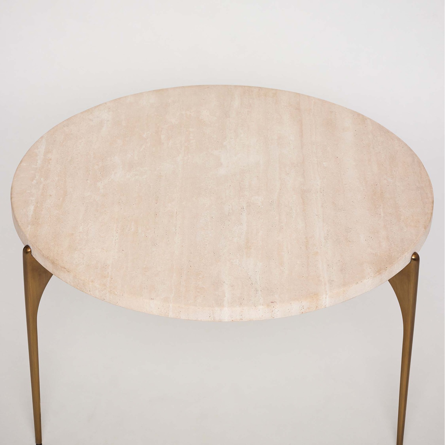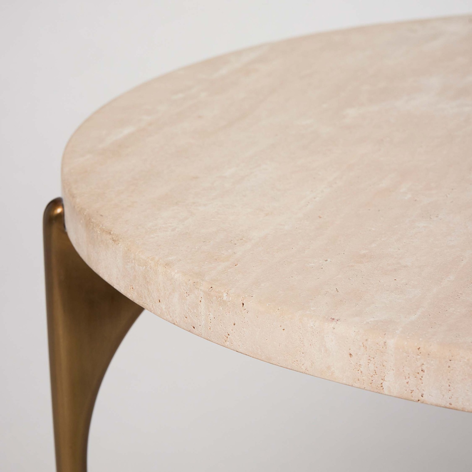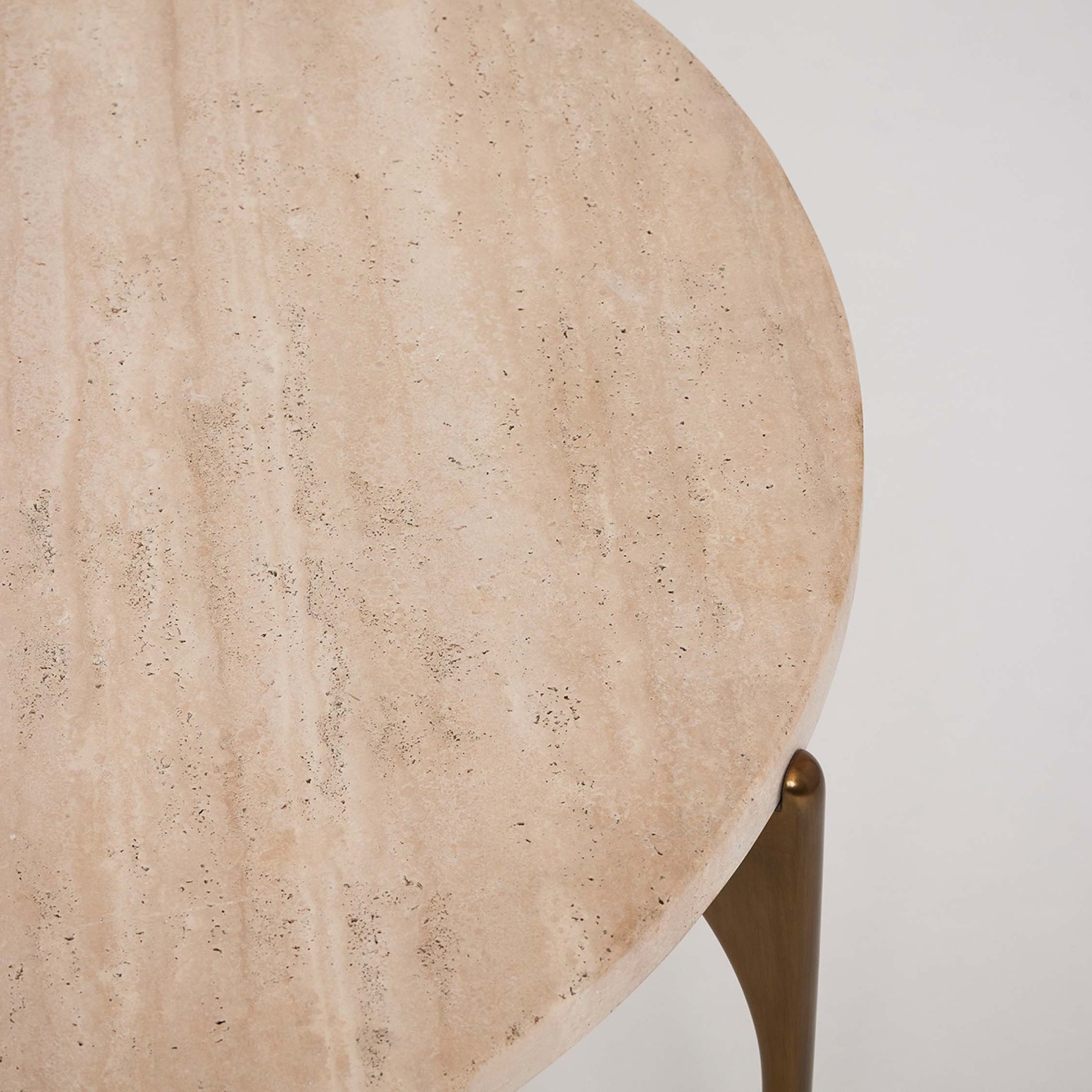 Subdued but stunning, the Richmond Large Side Table boasts a fabulous raw travertine top and lithe stainless steel legs in golden bronze.