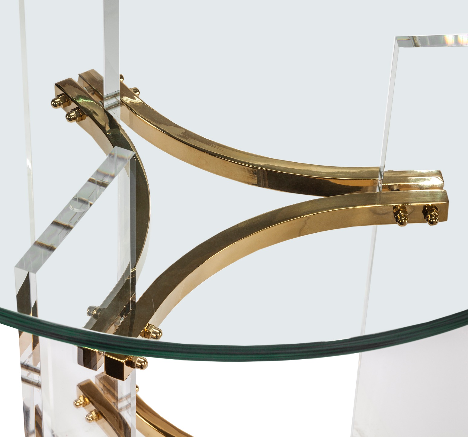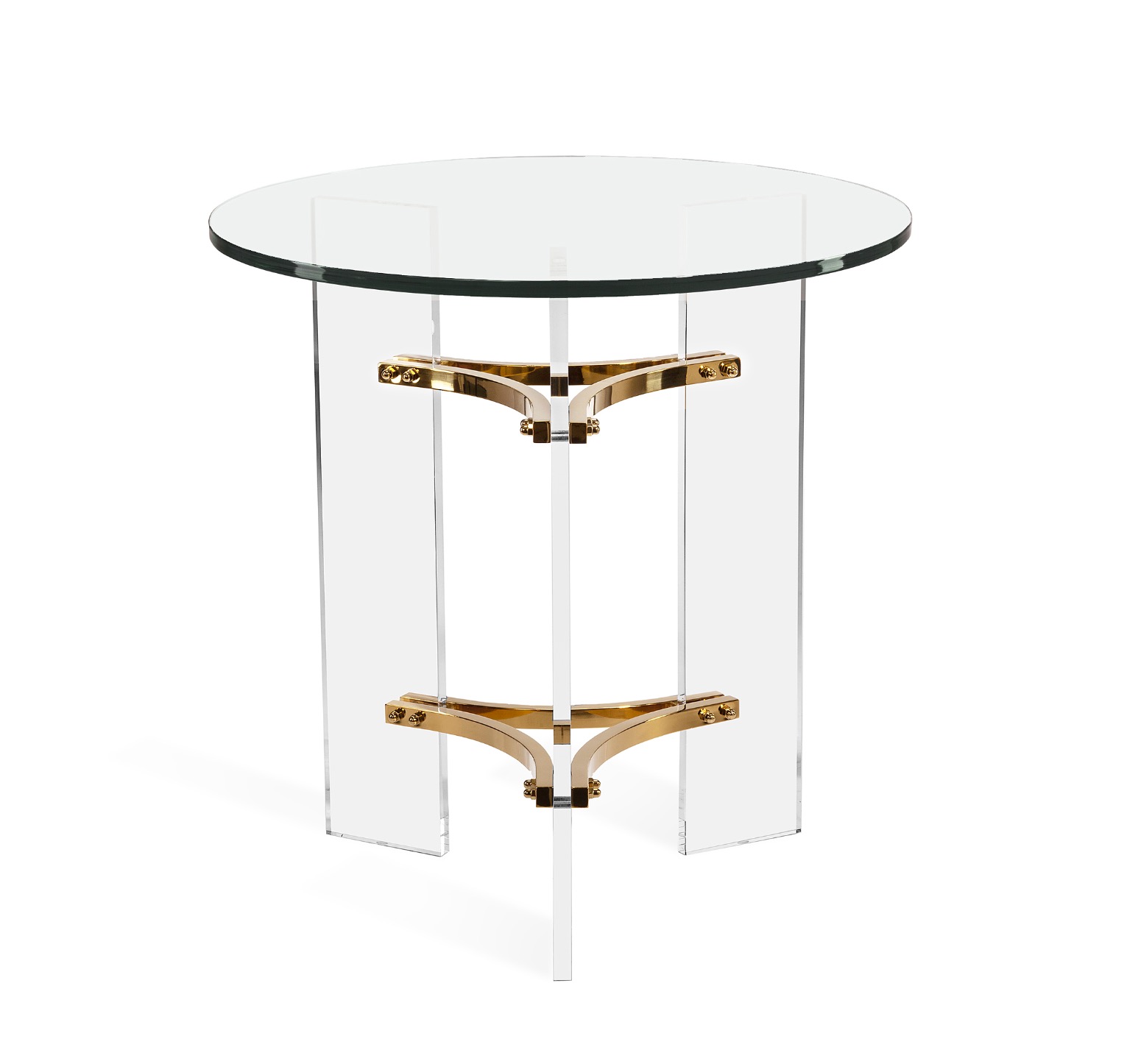 A unique acrylic and polished brass-finished stainless steel base make the glass Tamara Side Table into a statement piece.