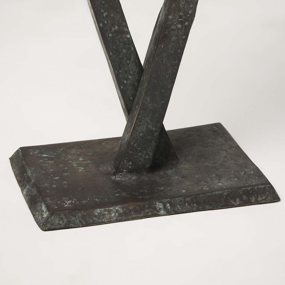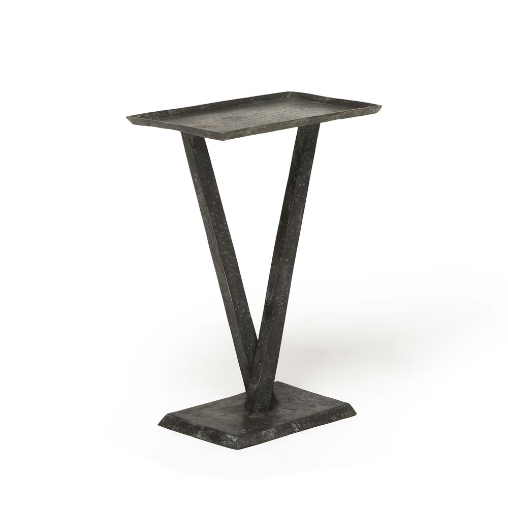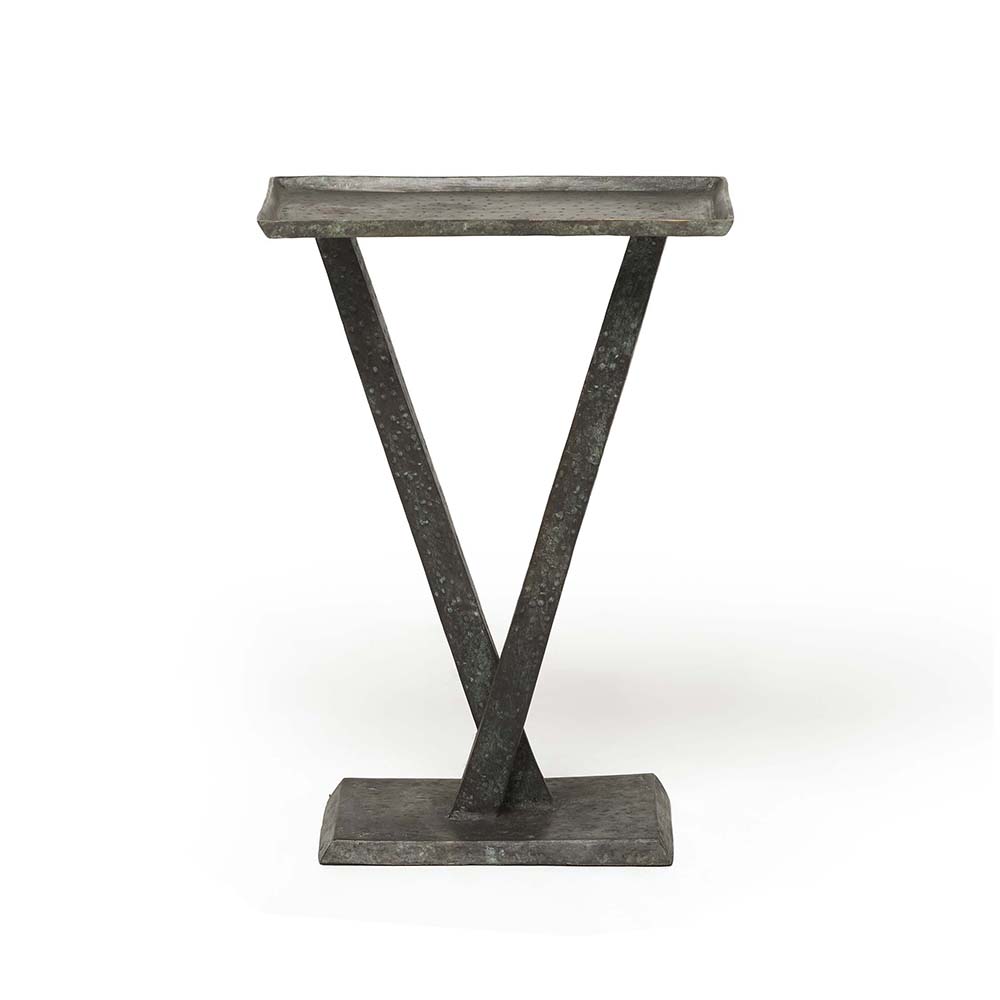 Contemporary meets artisanal in this bronze accent table thanks to clean lines, a hammered texture and a verdigris finish.