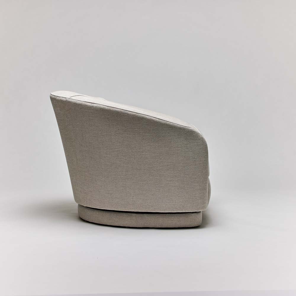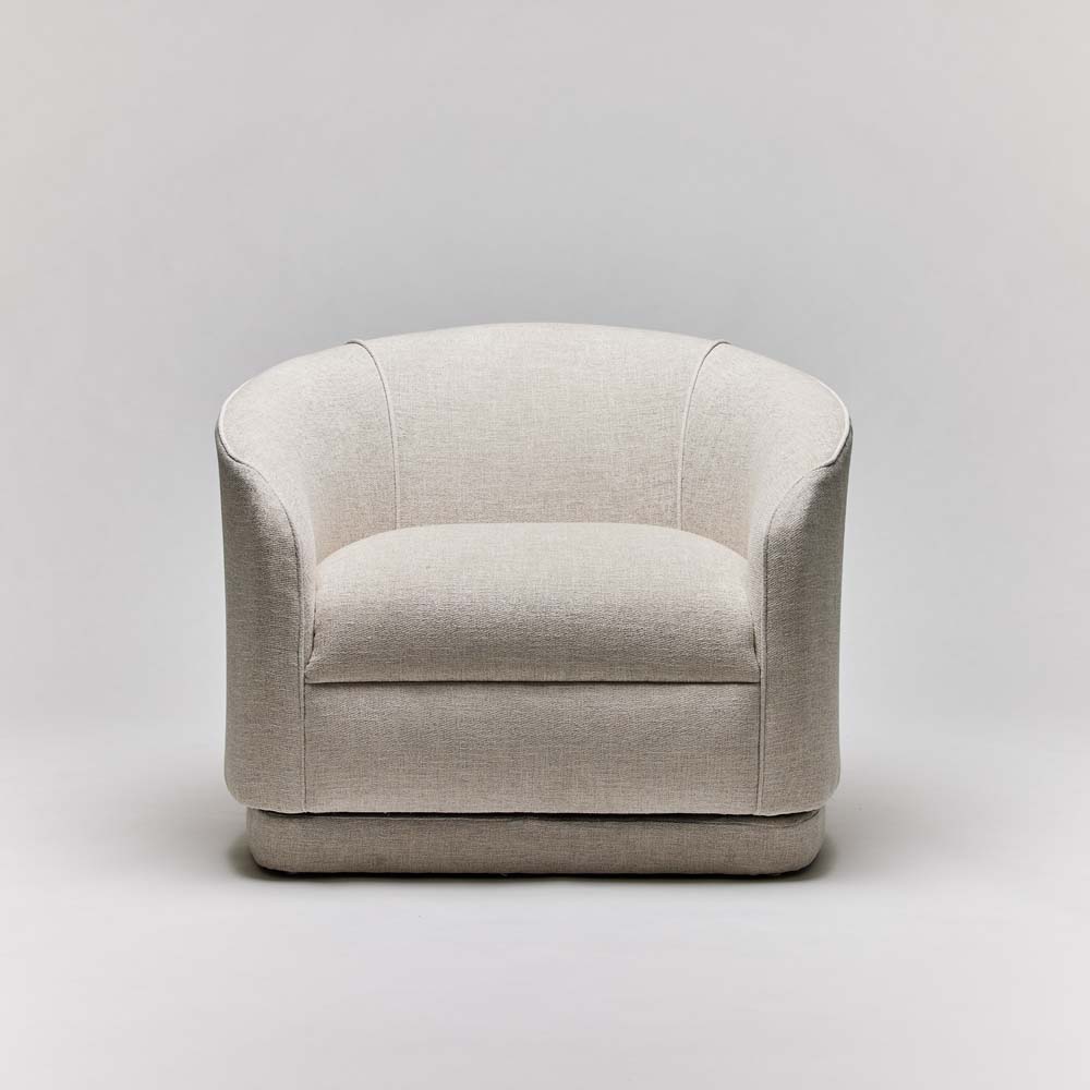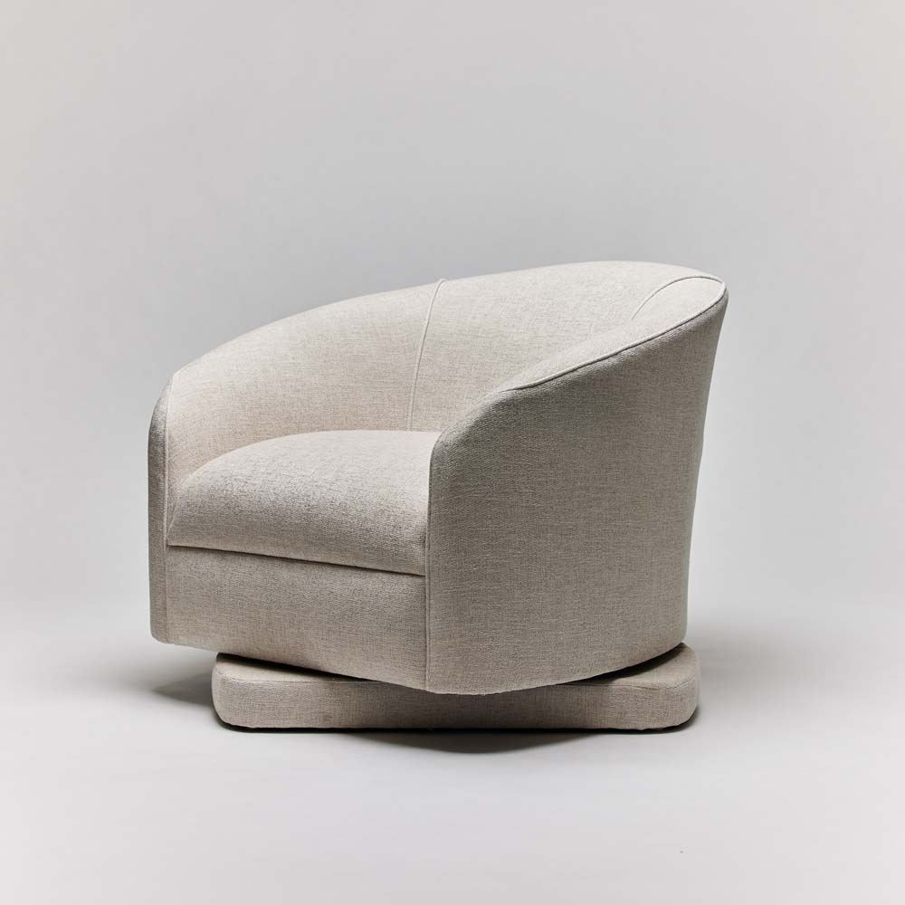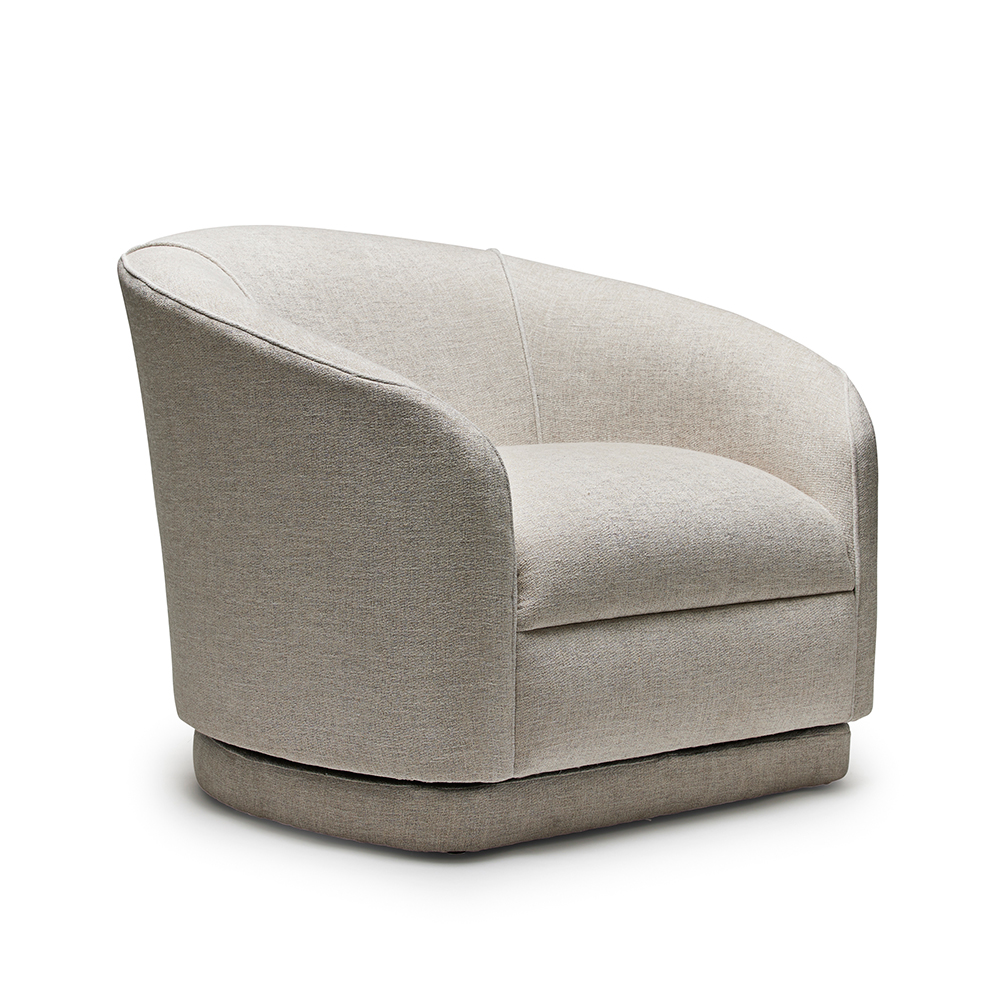 The Freemont Swivel Chair, with its Art Deco vibes and fun swivel, is a smooth operator. All hardwood frame with interlocking construction. Advanced unidirectional web seating suspension. Tight seat cushions and tight back cushions with premium polyurethane foam and 100% polyester fiber. Upholstered Plinth base. Available in Interlude Home Custom Upholstery fabrics, COM, or COL.