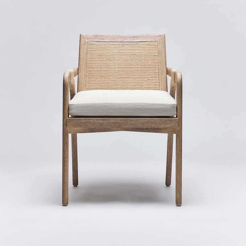 White ceruse paired with off white caning lends the Delray Arm Chair an airy and inviting whiff of sophistication.