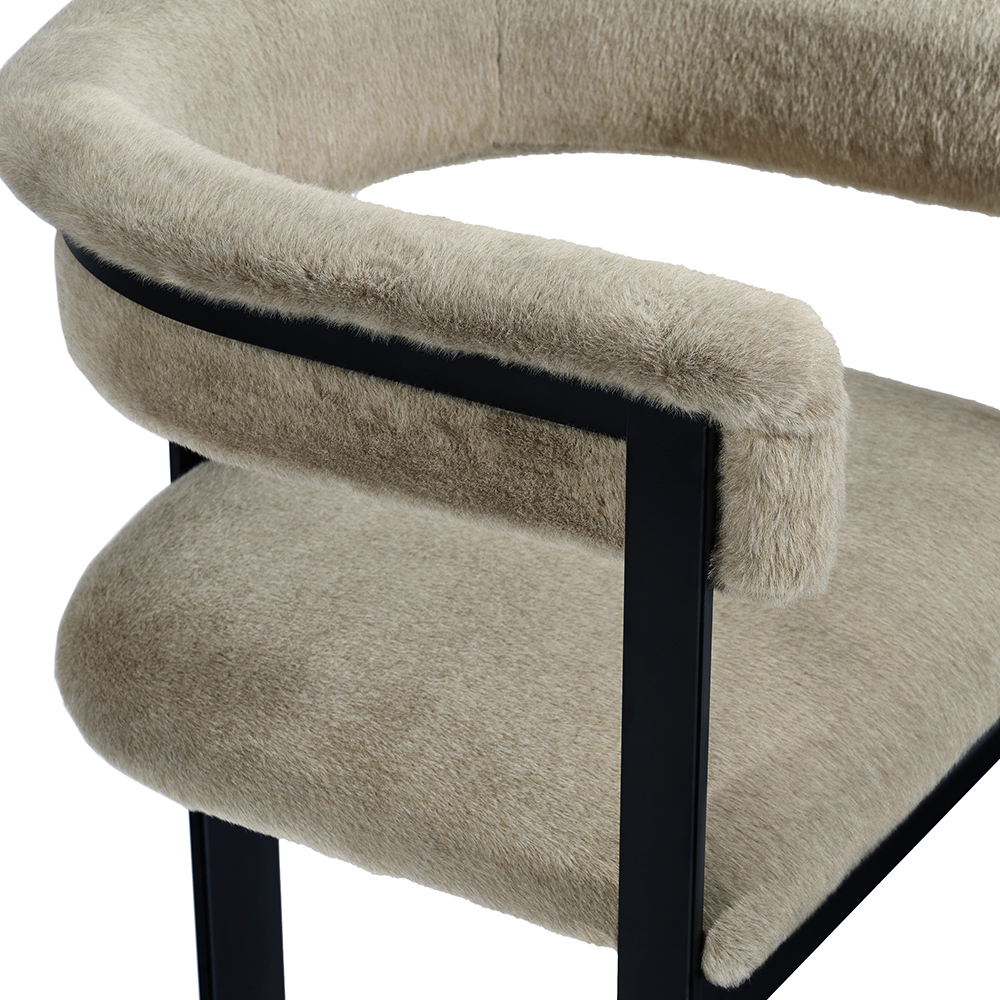 Boasting an art moderne influence, the Darcy Dining Chair juxtaposes a luxe cashmere fawn seat with a streamlined stainless steel frame in a matte black finish.