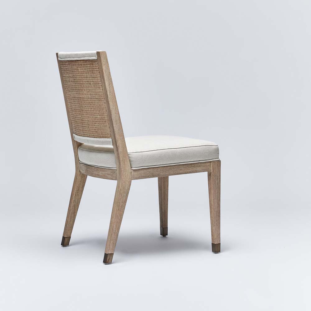 So easy and so flexible, the Largo Dining Chair features a white ceruse mahogany frame, natural flax upholstery and dark antique brass finished fittings.