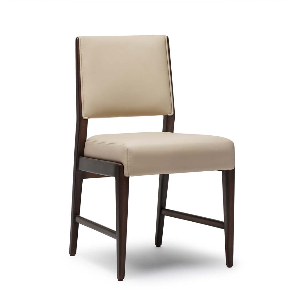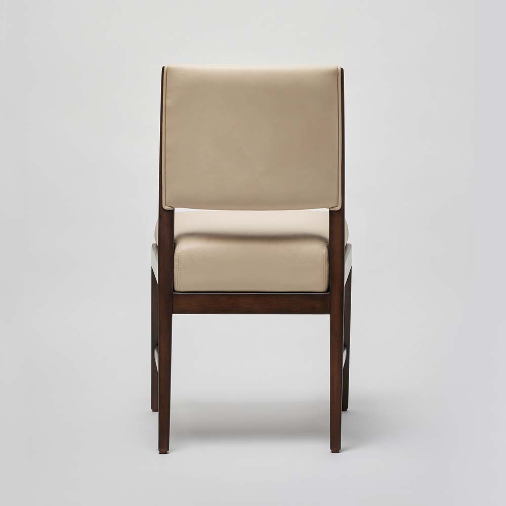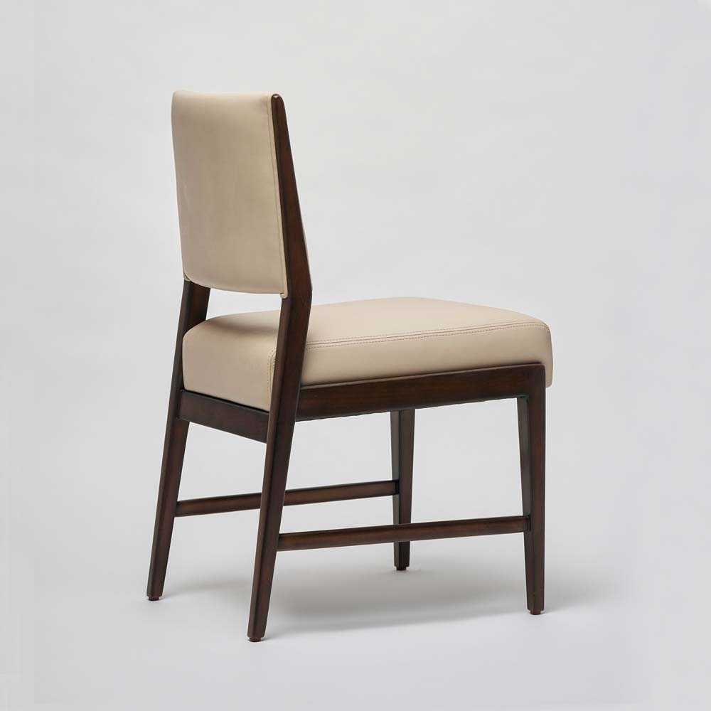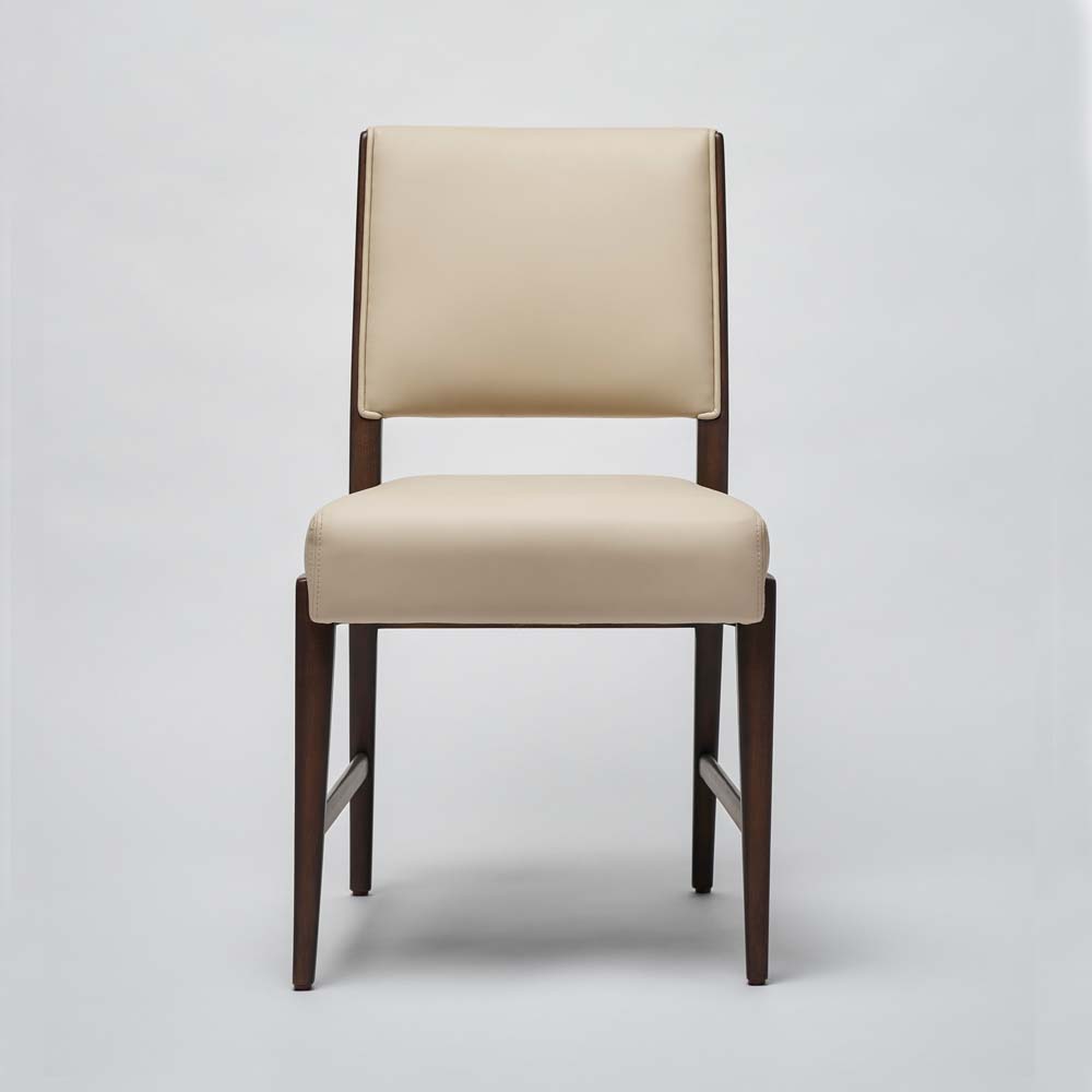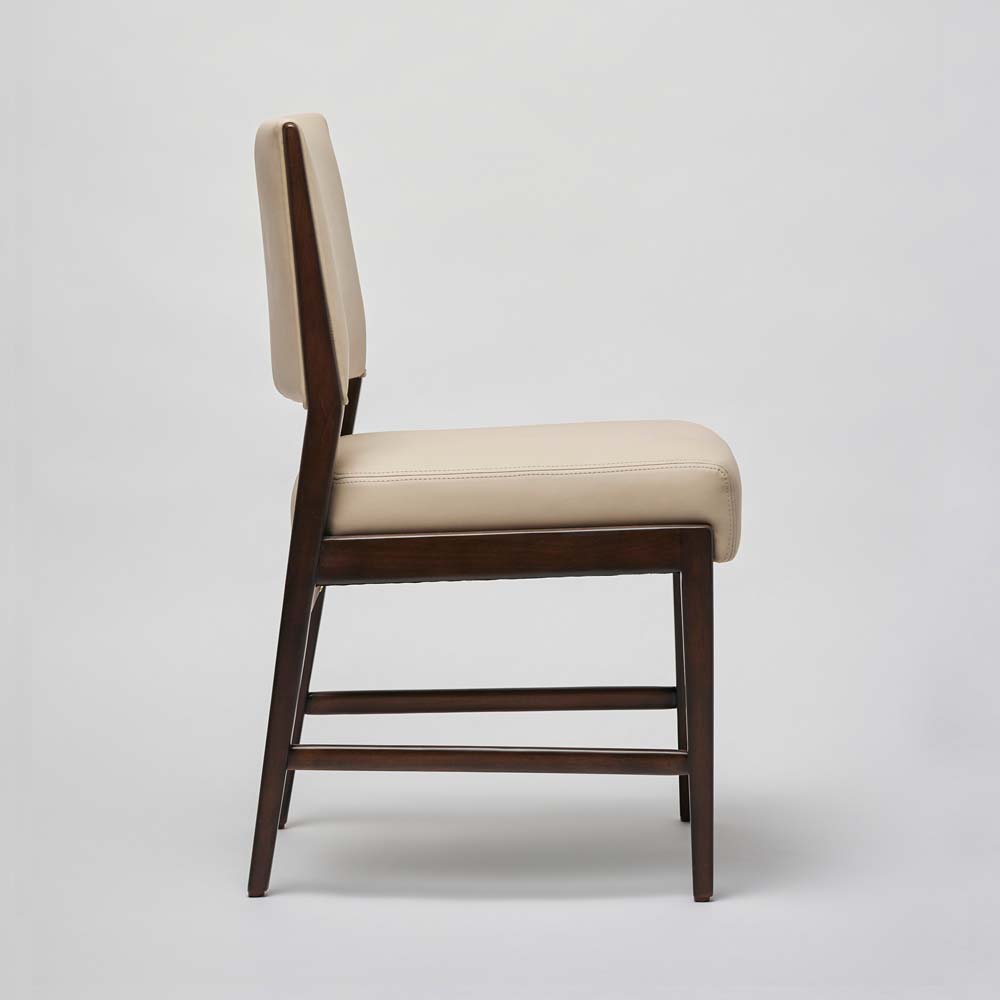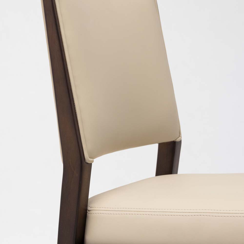 Classic and elegant, the Ludlow Dining Chair gets an elevated twist with its walnut stained wood frame and cream latte vegan leather upholstery.