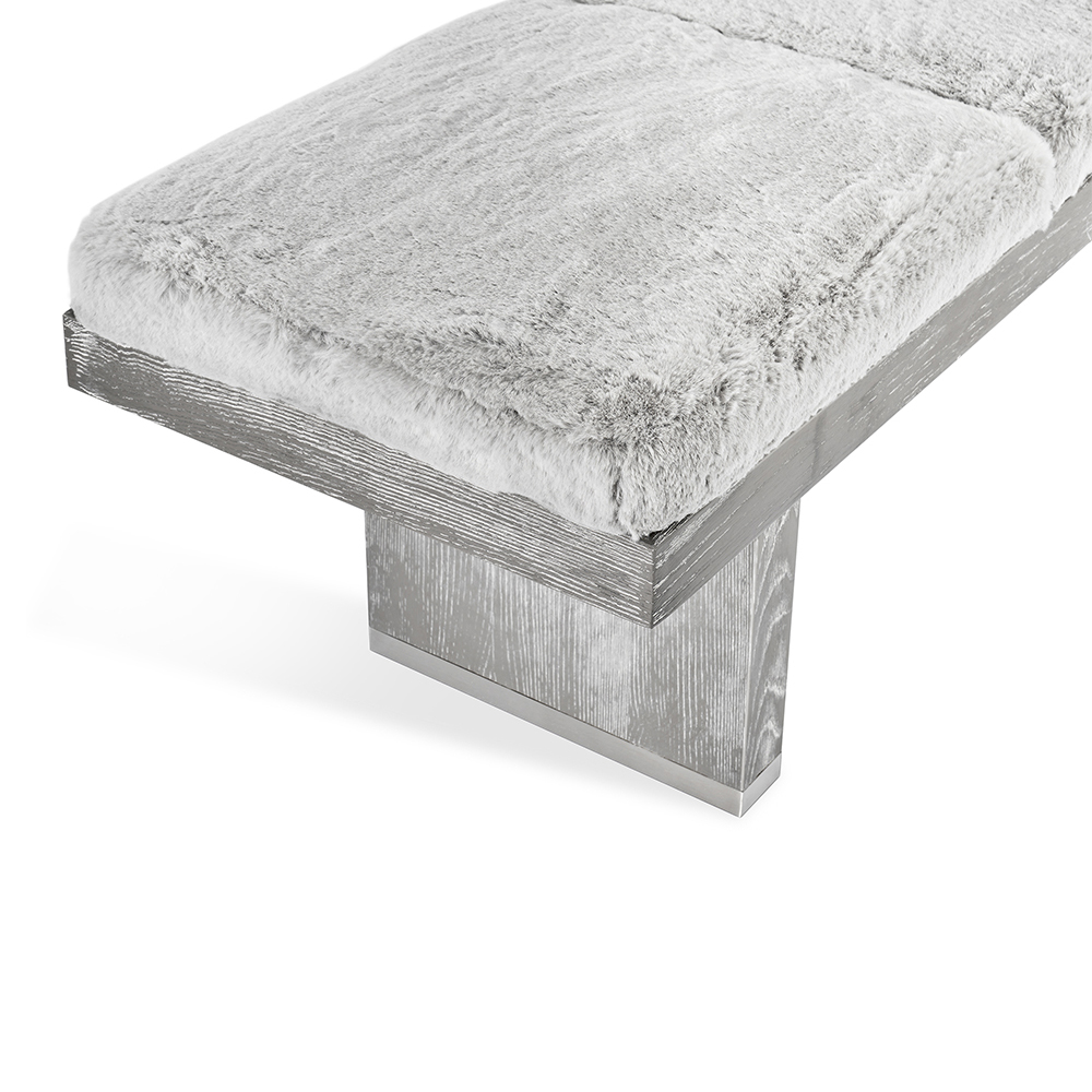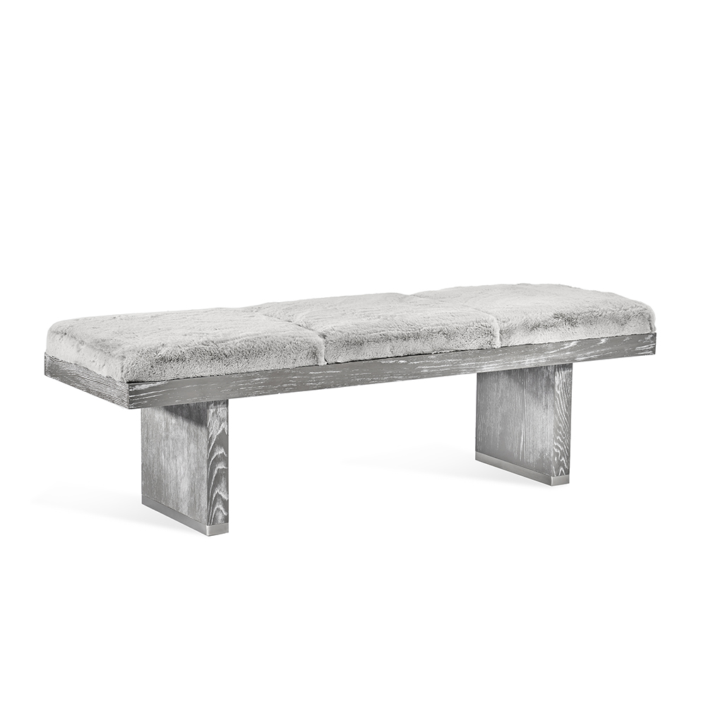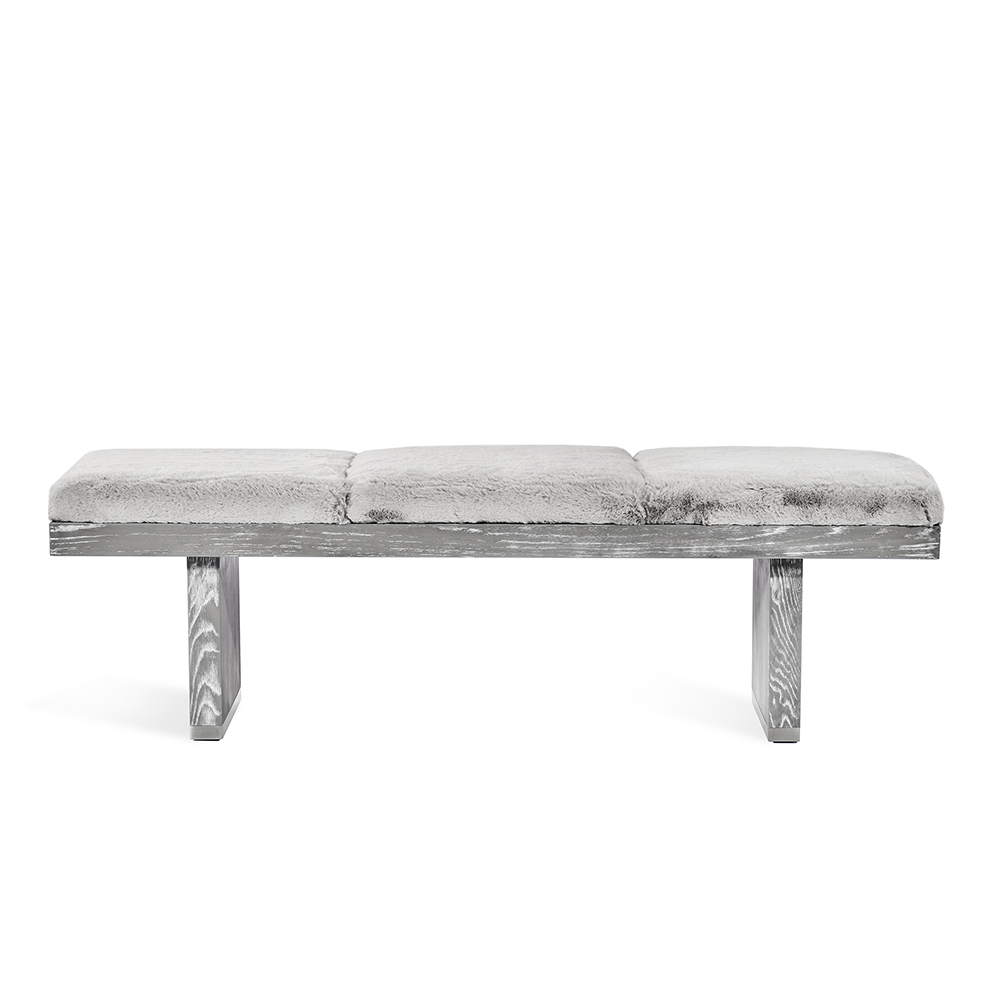 Fabulous textures come together in the Aaron Bench, thanks to a selection of custom fabric and an grey wash wood frame with nickel accents.