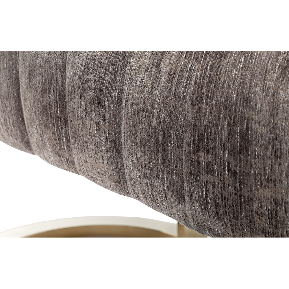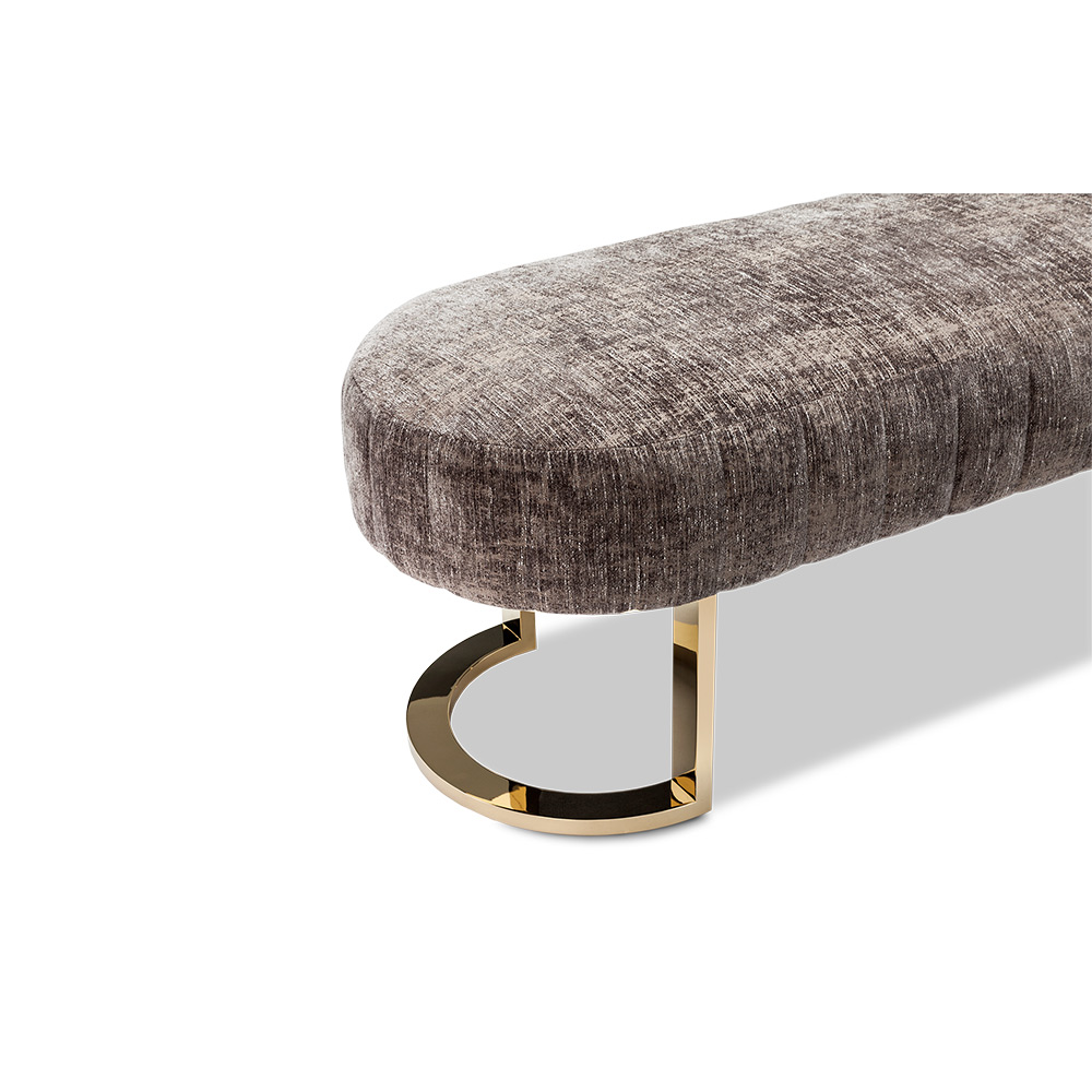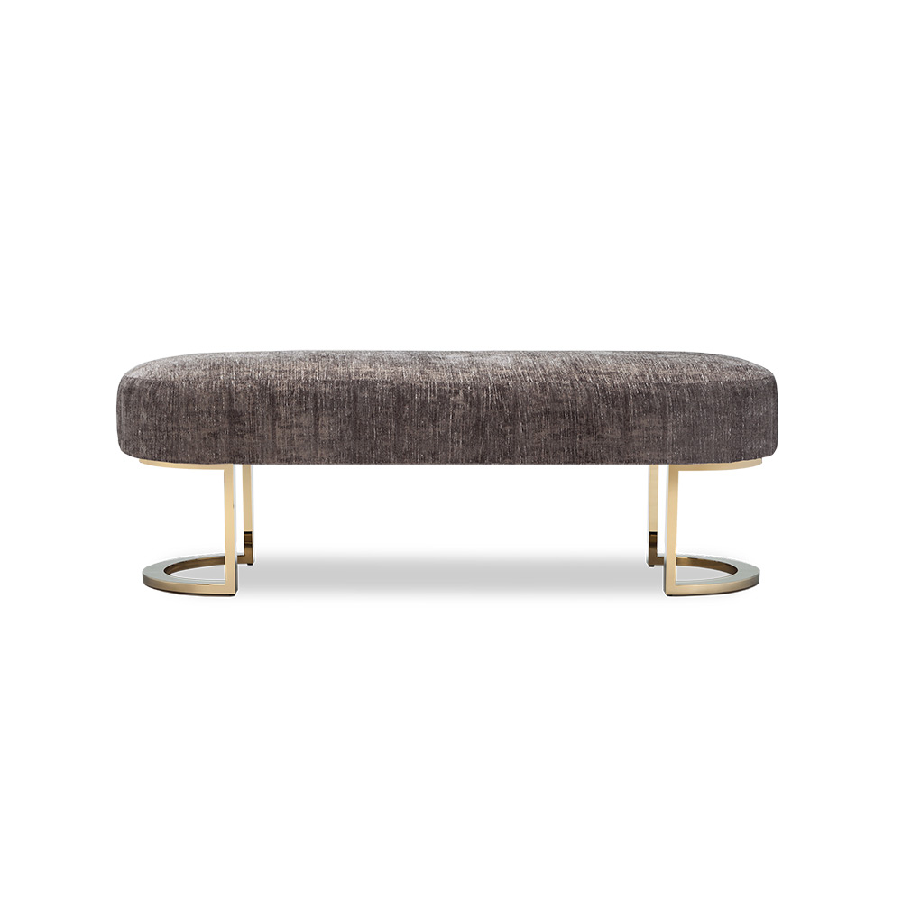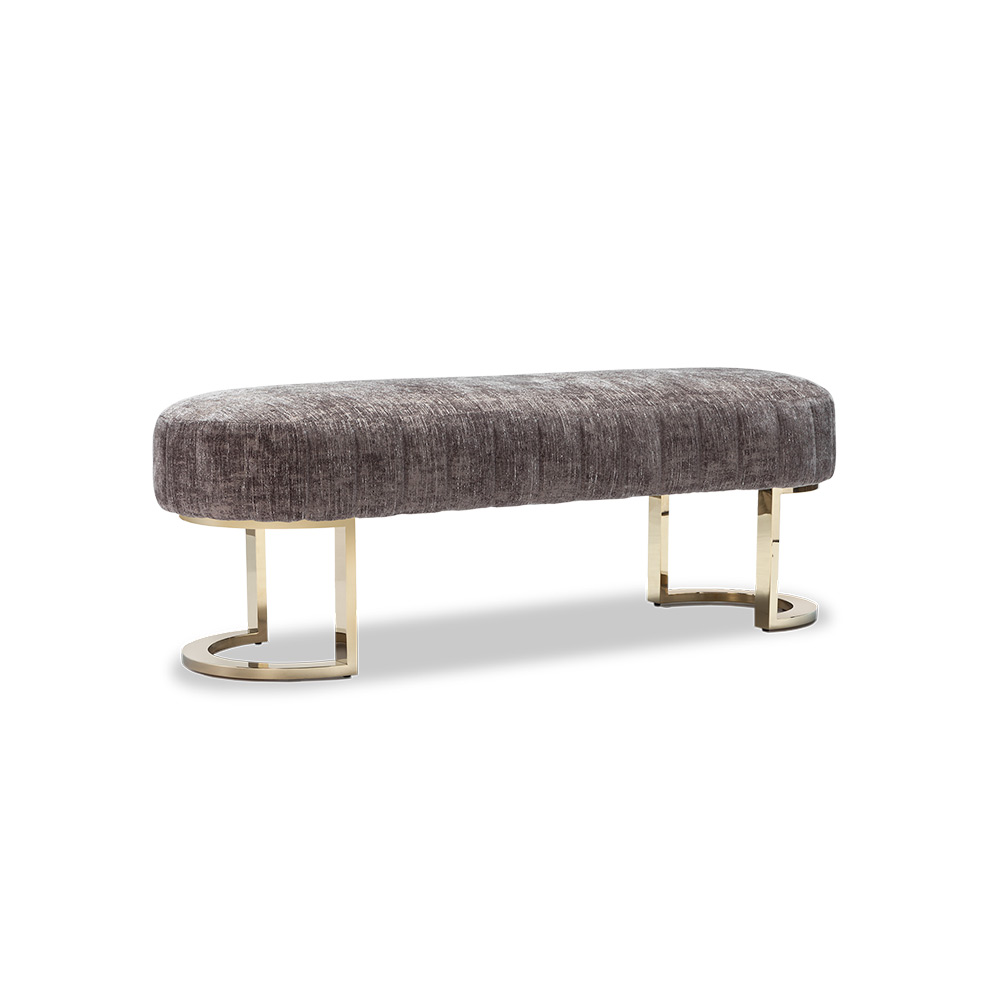 Shiny brass stainless steel legs and a seat in 46216-02 fabric.bring statement-making style to this completely chic and versatile bench. All hardwood frame with interlocking construction. Advanced unidirectional web seating suspension. Tight seat with premium polyurethane foam and 100% polyester fiber. Shiny brass base. Custom fabric selection available.
