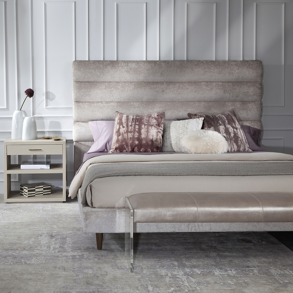 The Channel Tall King Bed exudes subtle style and sophistication. All hardwood frame with interlocking construction. Hardwood slat system with center support leg. Choice of leg finish. Available in Interlude Home Custom Upholstery fabrics, COM, or COL.