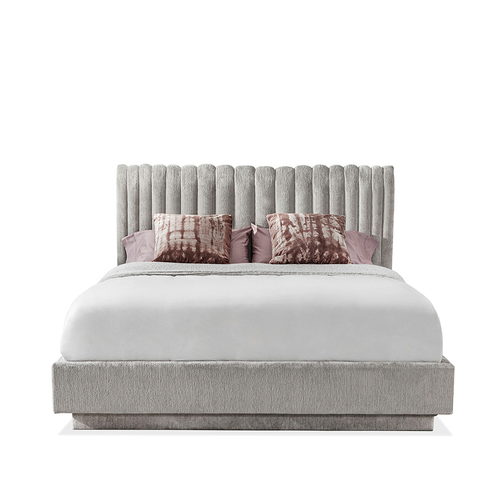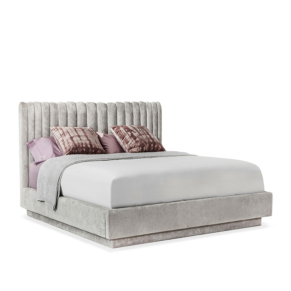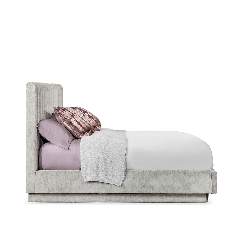 Art Deco-inspired and stunningly glamorous, the Heyworth Bed - Tall evokes swanky sophistication. All hardwood frame with interlocking construction. Padded with premium polyurethane foam and 100% polyester fiber. Upholstered plinth. Available in Interlude Home Custom Upholstery fabrics, COM, or COL.