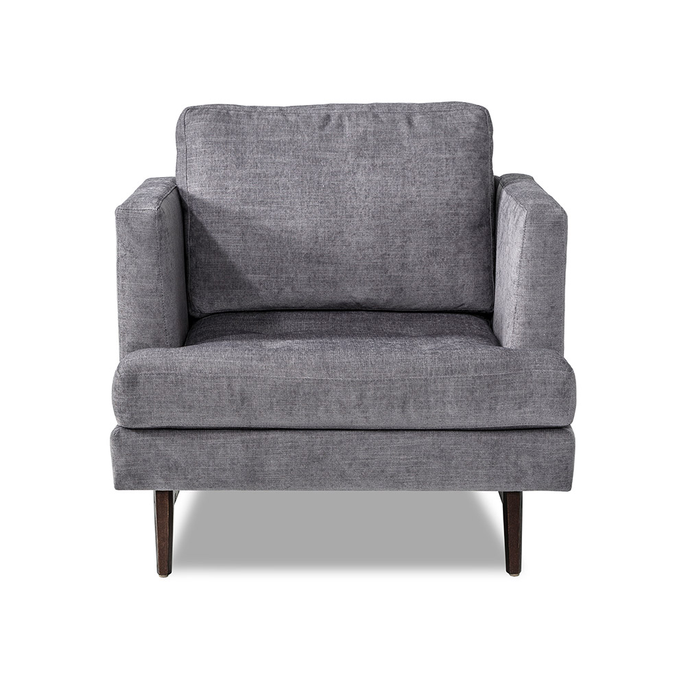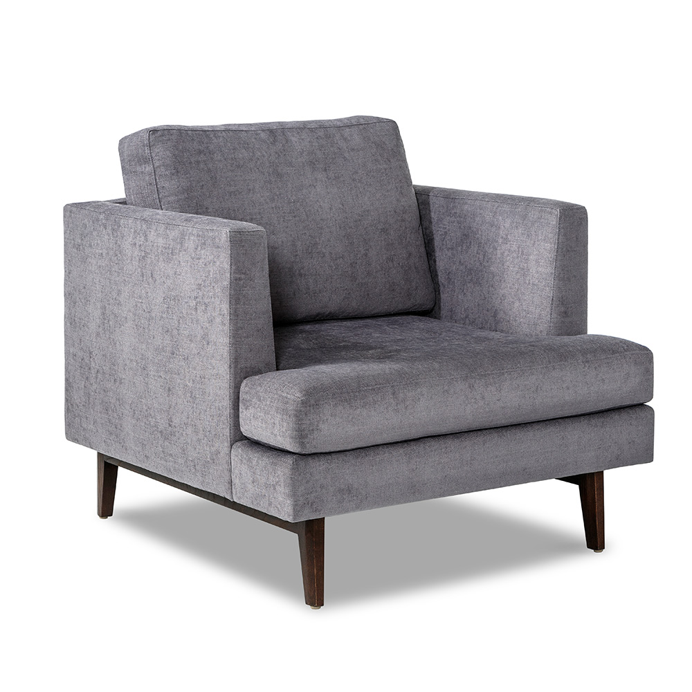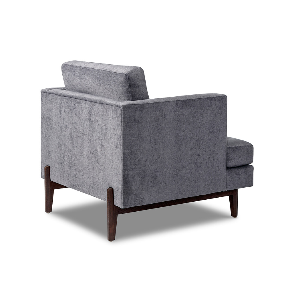 A fresh interpretation of a classic club chair, the Ayler Chair surrounds with comfort. All hardwood frame with interlocking construction. Advanced unidirectional web seating suspension. Tight seat with tufted detail and loose back with premium polyurethane foam and 100% polyester fiber. Wood legs available in various finishes. Available in Interlude Home Custom Upholstery fabrics, COM, or COL