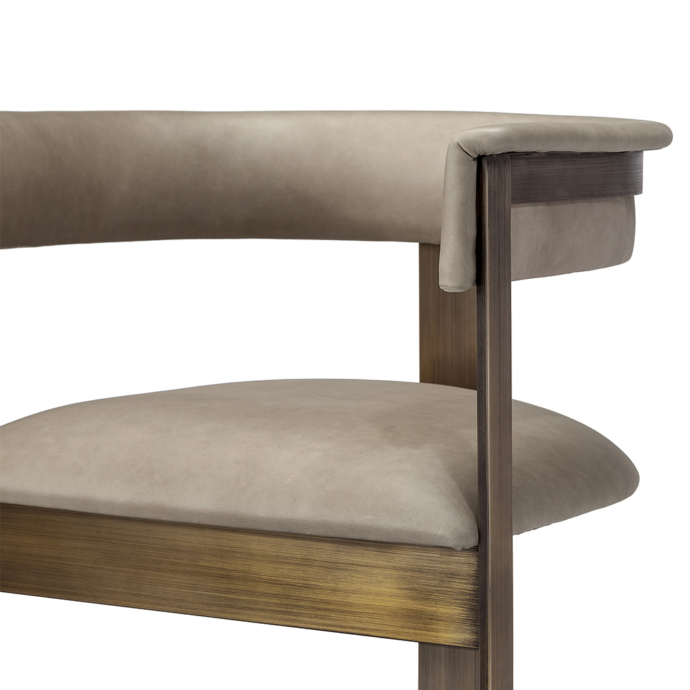 Boasting an art moderne influence, the Darcy Dining Chair features a streamlined stainless steel frame in an antique bronze finish. Custom fabric selection available.