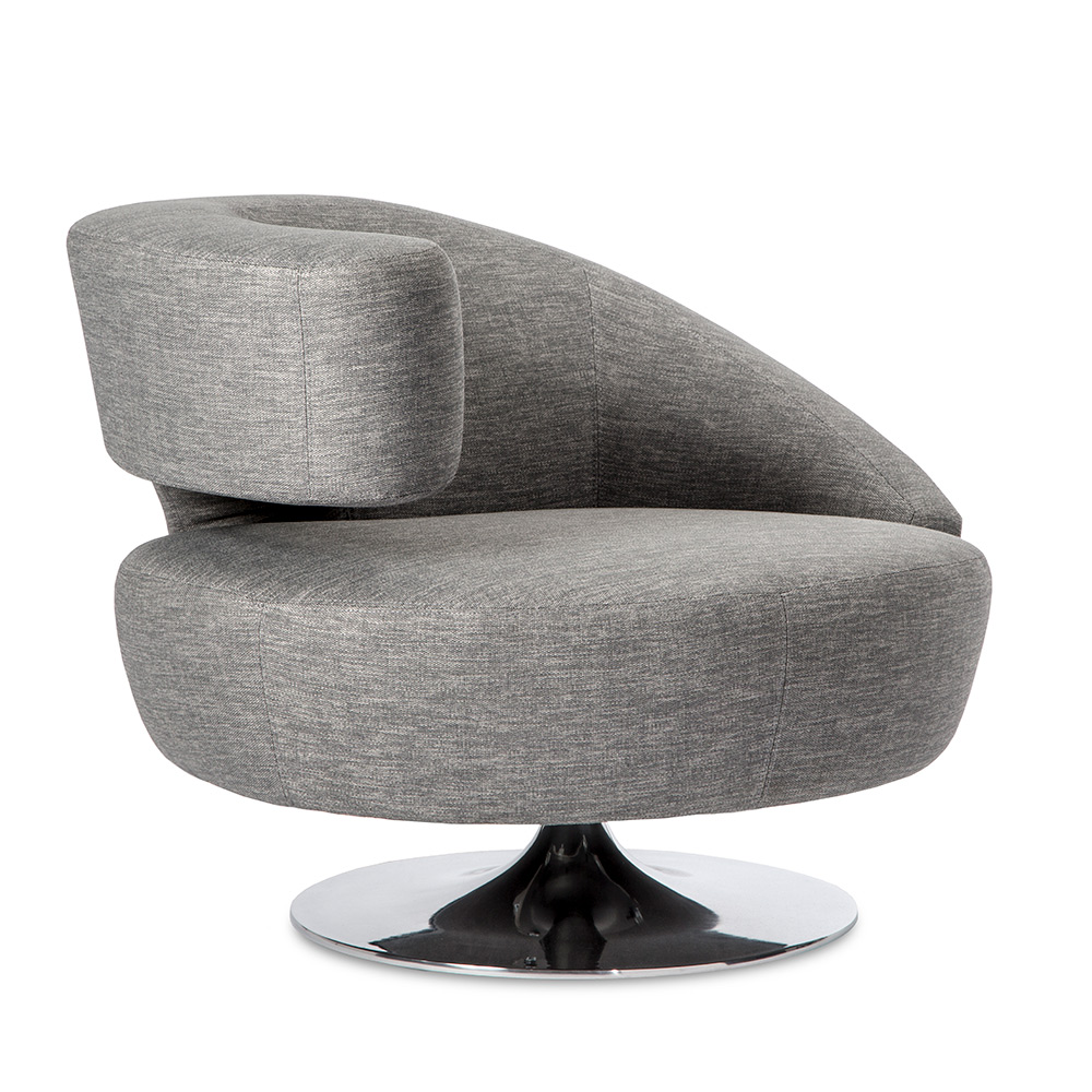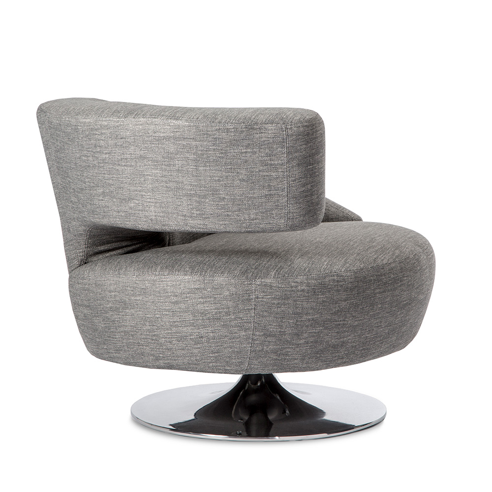 Boasting an ultra-cool chrome base, the curvy Isabella Swivel Chair is playful and stylish. All hardwood frame with interlocking construction. Advanced unidirectional web seating suspension. Tight seat and back with premium polyurethane foam and 100% polyester fiber. Metal swivel base in a chrome finish. Available in Interlude Home Custom Upholstery fabrics, COM, or COL. Item is available in both left and right configurations.