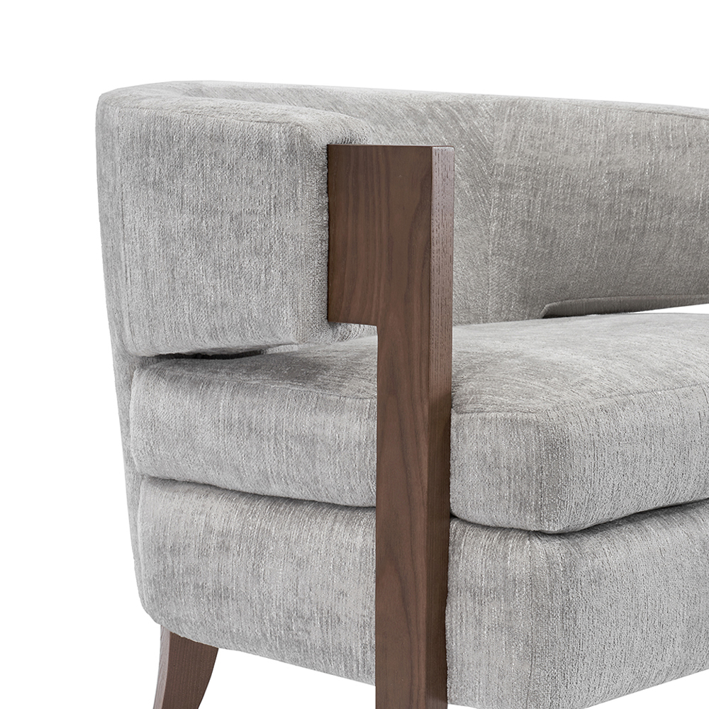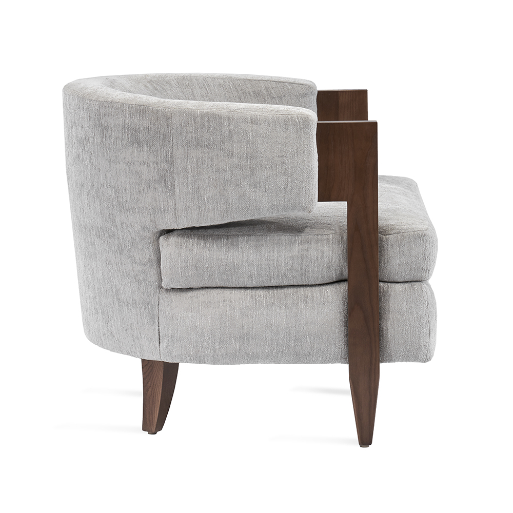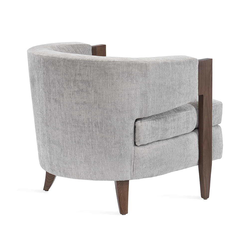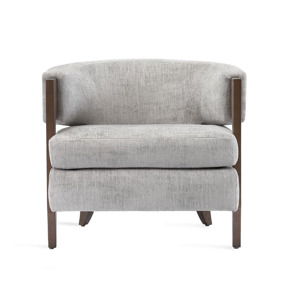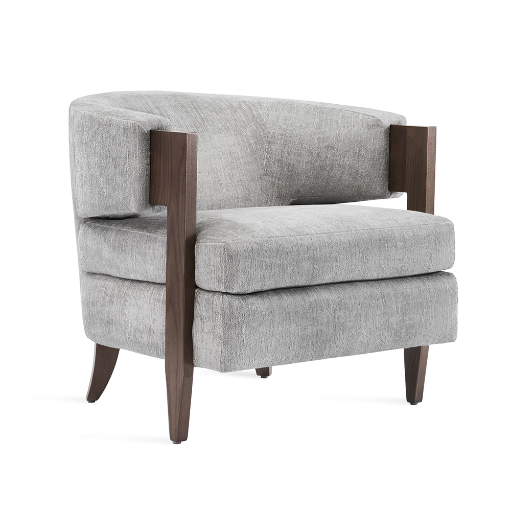 Solid wood legs add natural warmth to the curved-back Kelsey Classic Chair. All hardwood frame with interlocking construction. Advanced unidirectional web seating suspension. Loose seat cushion and tight back with premium polyurethane foam and 100% polyester fiber. Choice of finish on wood arms and legs. Available in Interlude Home Custom Upholstery fabrics, COM, or COL.