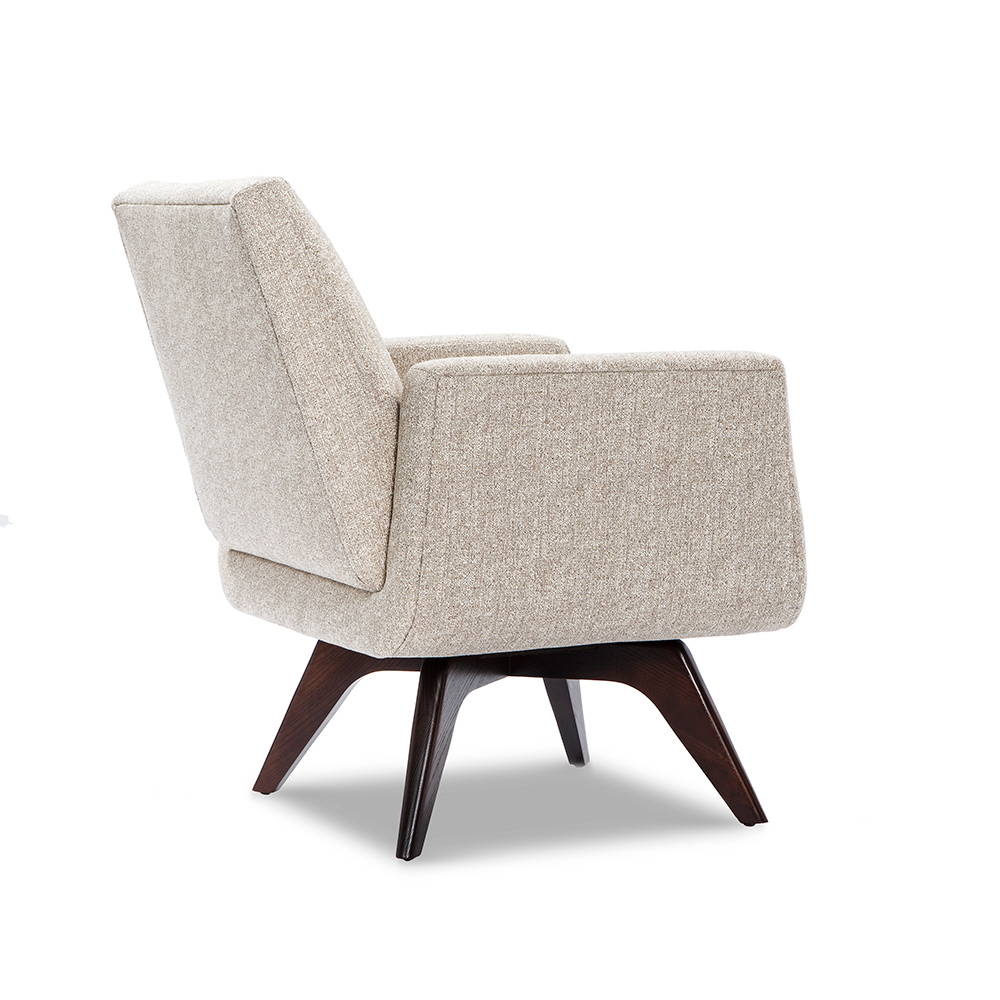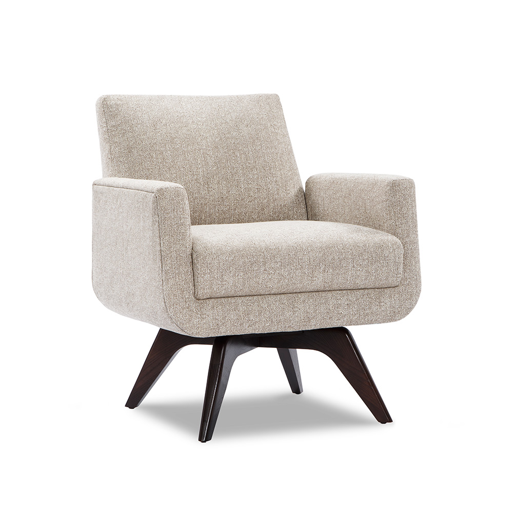 A hardwood base supports the Landon Chair and makes for a classic, handsome addition to any living space. Shown in 43006-79 fabric. All hardwood frame with interlocking construction. Advanced unidirectional web seating suspension. Tight seat and back with premium polyurethane foam and 100% polyester fiber. Available with choice of wood finish. Custom fabric selection available.