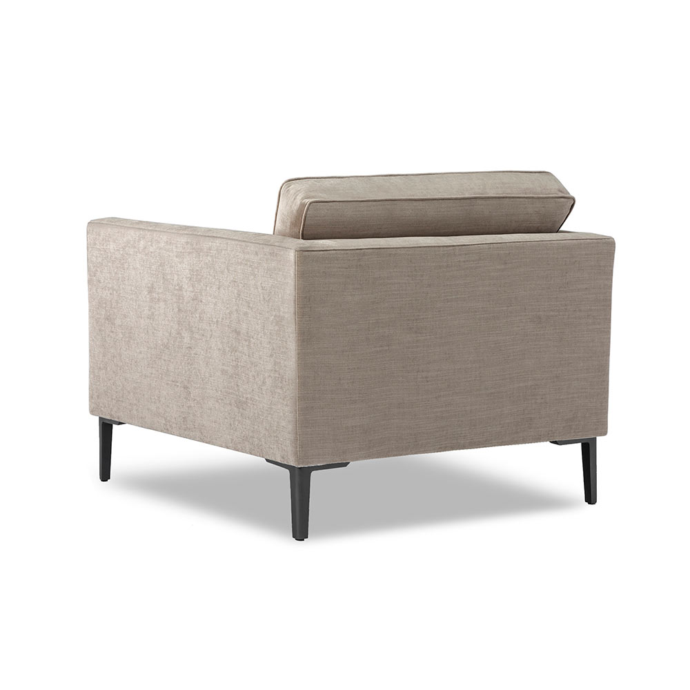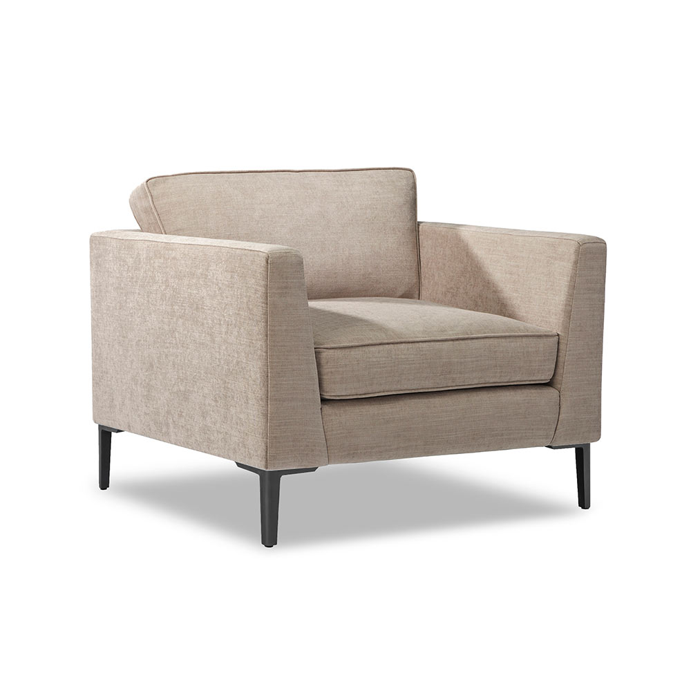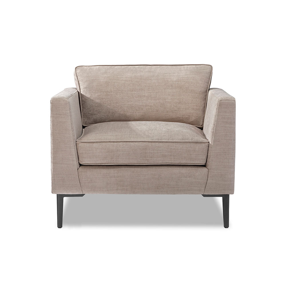 The conversation-sparking Miles II Chair is a handsome addition to any space. All hardwood frame with interlocking construction. Advanced unidirectional web seating suspension. Loose seat cushion and loose back cushion with premium polyurethane foam and 100% polyester fiber. Metal base with bronze or pewter finish. Available in Interlude Home Custom Upholstery fabrics, COM, or COL.