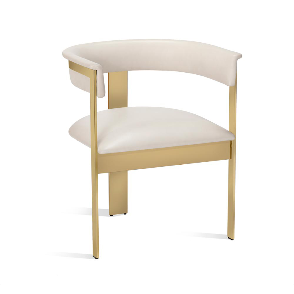 Boasting an art moderne influence, the Darcy Dining Chair features a streamlined stainless steel frame in a polished brass finish. Metal frame with tight seat cushion and tight back cushion. Premium polyurethane foam and 100% polyester fiber. Custom fabric selection available.