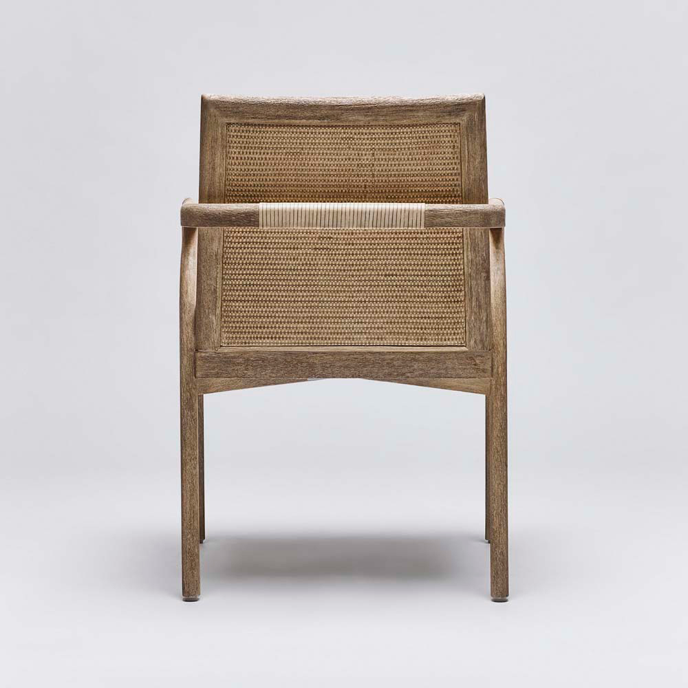 White ceruse paired with off white caning lends the Delray Arm Chair an airy and inviting whiff of sophistication.
