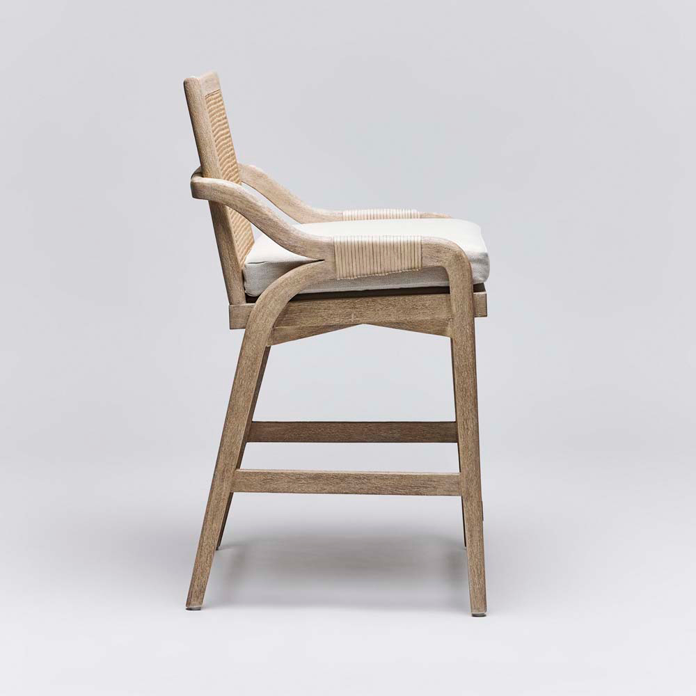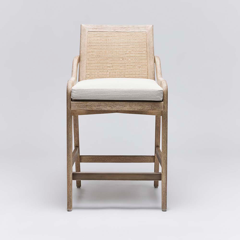 White ceruse wood paired with off white caning lends the Delray Counter Stool an airy and inviting whiff of sophistication.