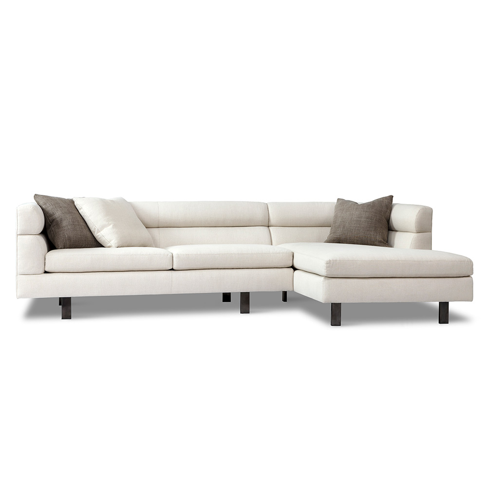 Luxuriant and enveloping, the Ornette Sectional is a stunning addition to any space. All hardwood frame with interlocking construction. Advanced unidirectional web seating suspension. Loose seat cushion and tight back with premium polyurethane foam and 100% polyester fiber. Stainless steel leg with bronze finish. Available in Interlude Home Custom Upholstery fabrics, COM, or COL.