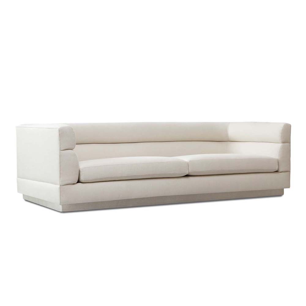 Luxuriant and enveloping, the Ornette Sofa with an upholstered plinth is a stunning addition to any space. All hardwood frame with interlocking construction. Advanced unidirectional web seating suspension. Loose seat cushion and tight back with premium polyurethane foam and 100% polyester fiber. Bronze legs and back supports also available in brushed stainless steel. Available in Interlude Home Custom Upholstery fabrics, COM, or COL.