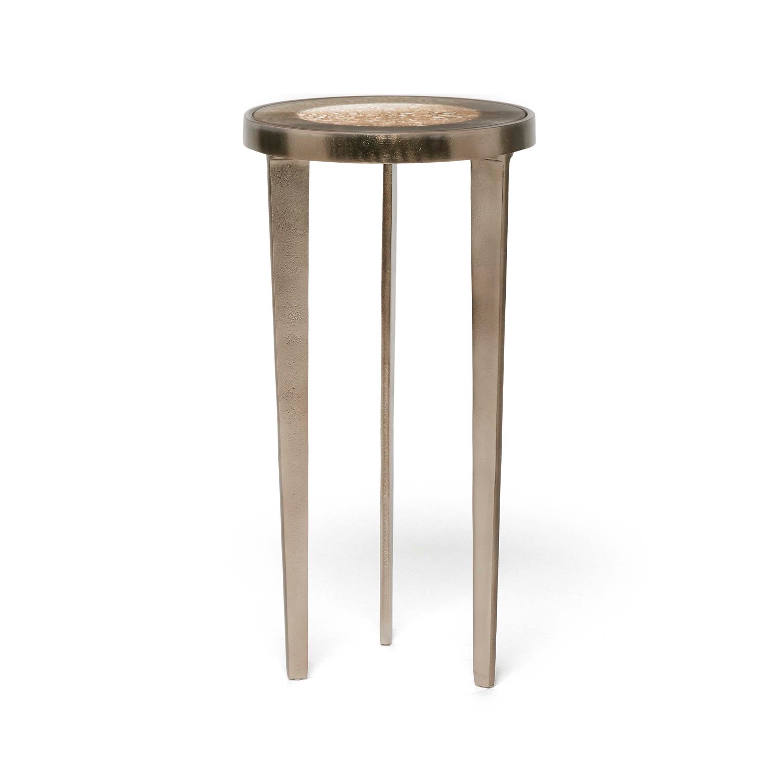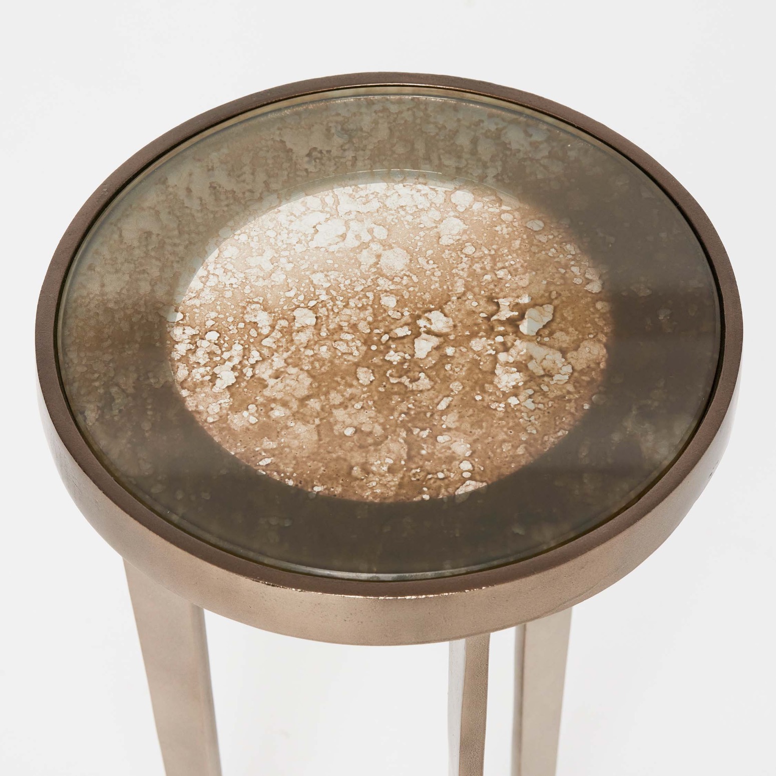 Twilight bronze reactive glass and an aluminum base in a twilight bronze finish add dramatic flair to the eye-catching Jan Round Drink Table.