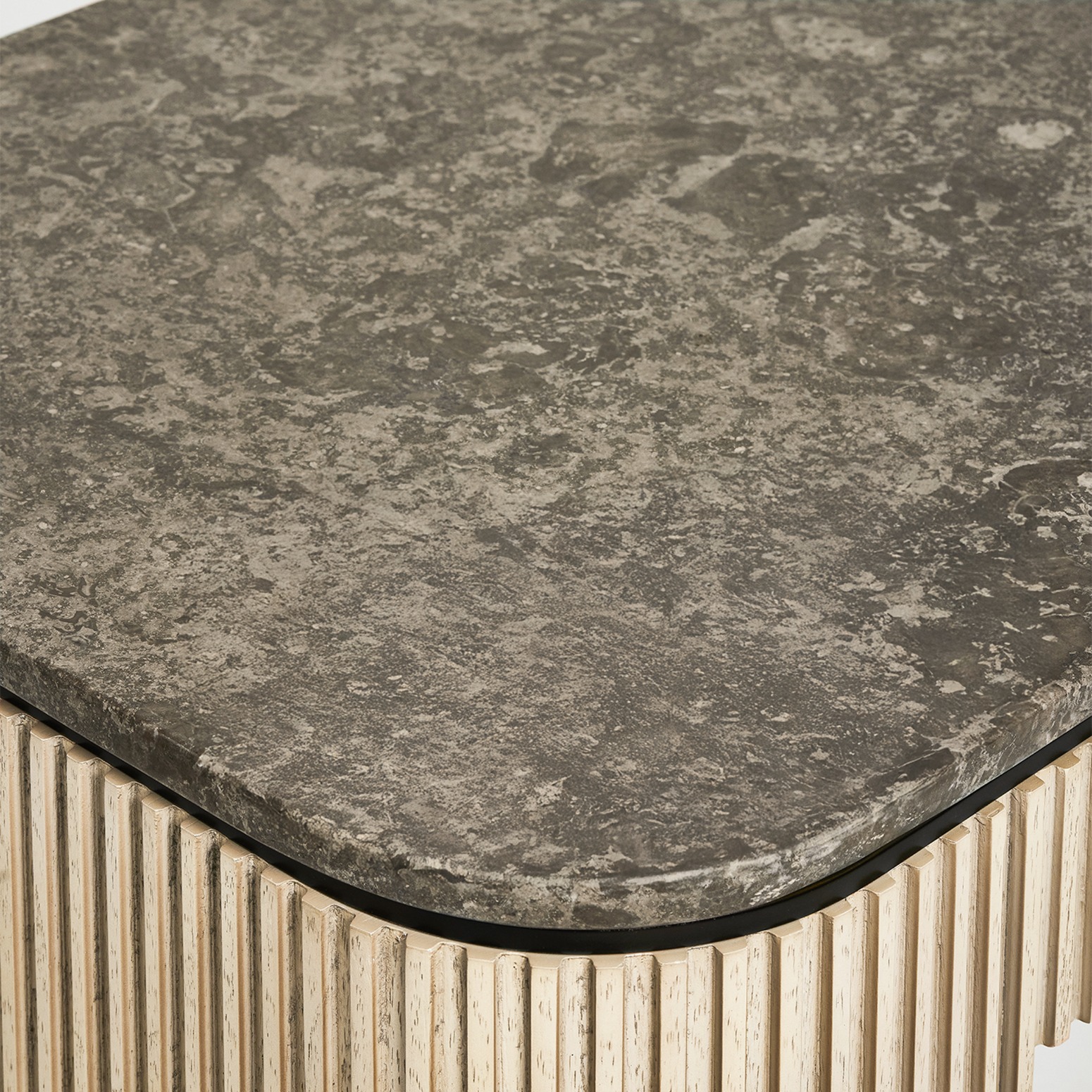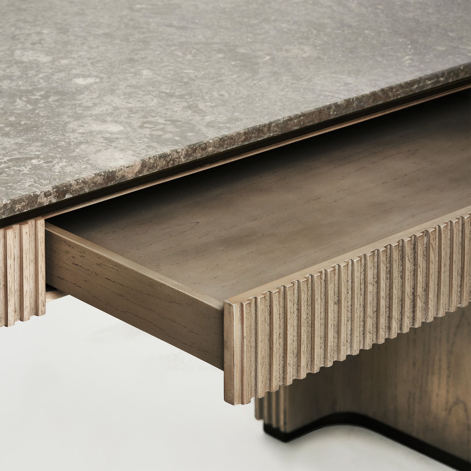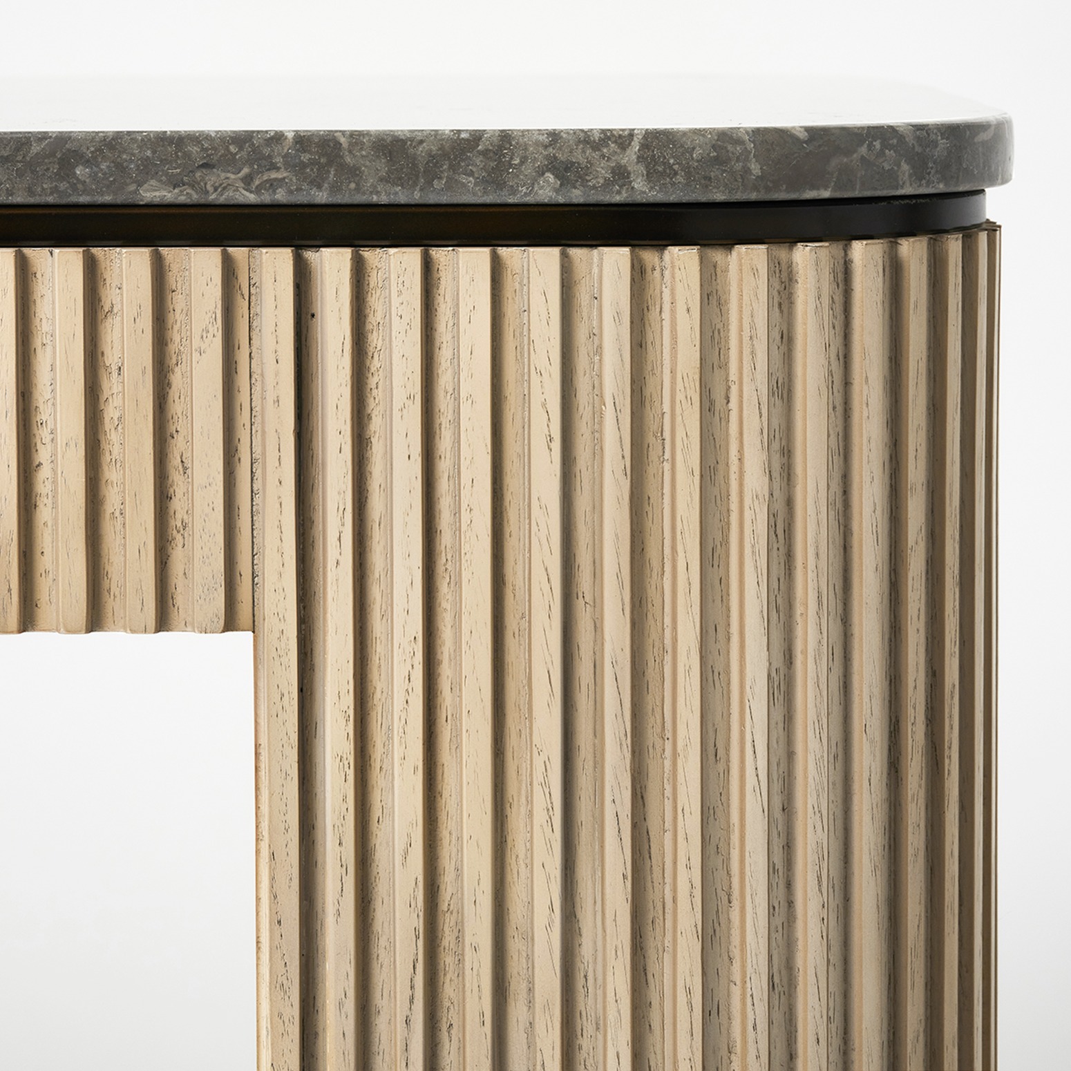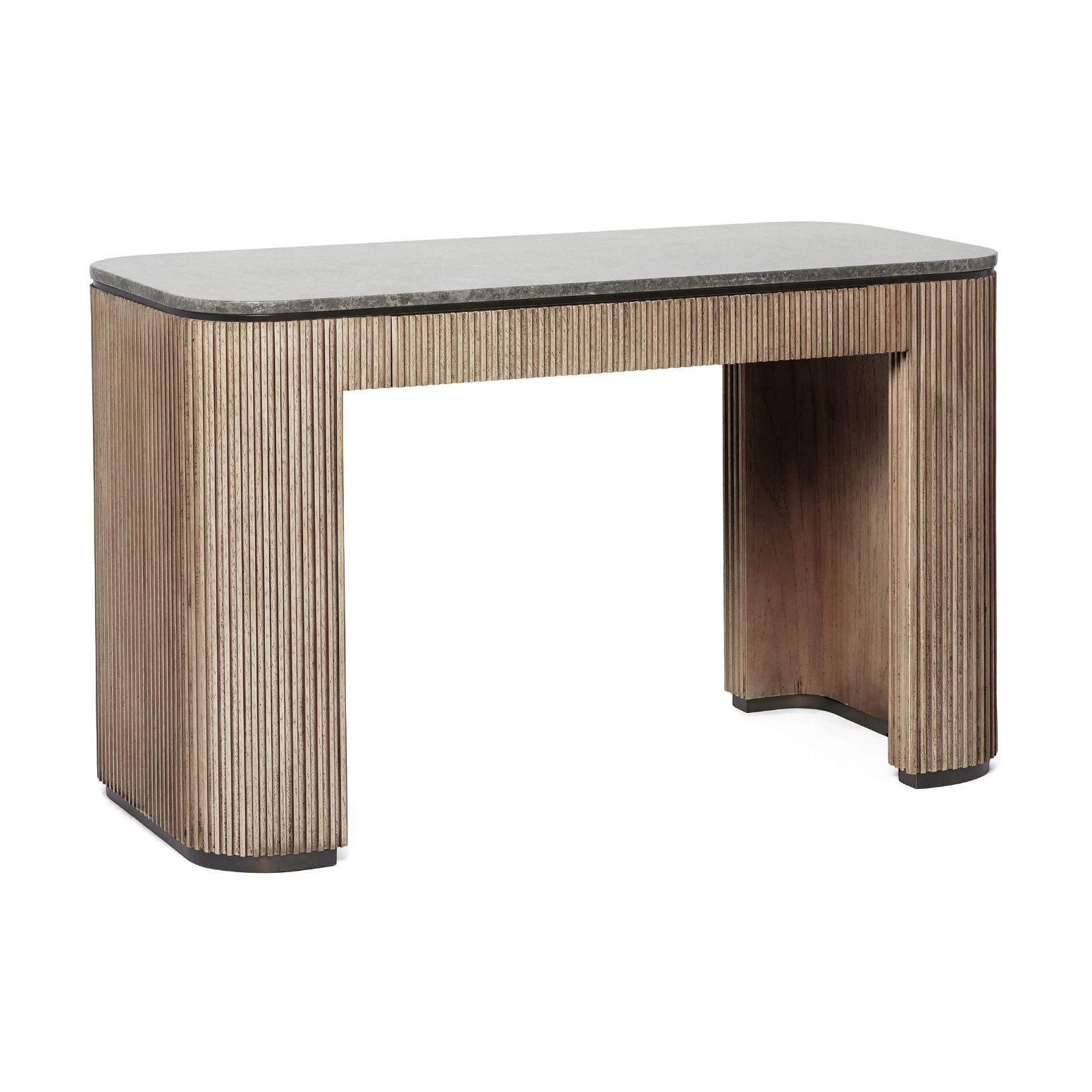 The Morrison Desk becomes a stunningly chic piece thanks to its fluted mindi wood in a washed taupe finish paired with a fossil marble top.