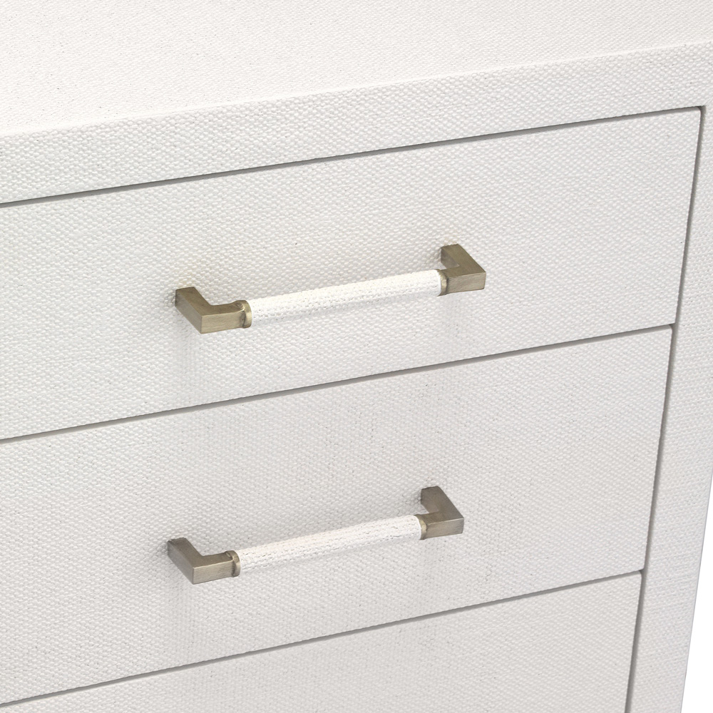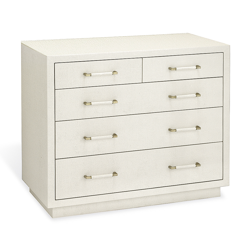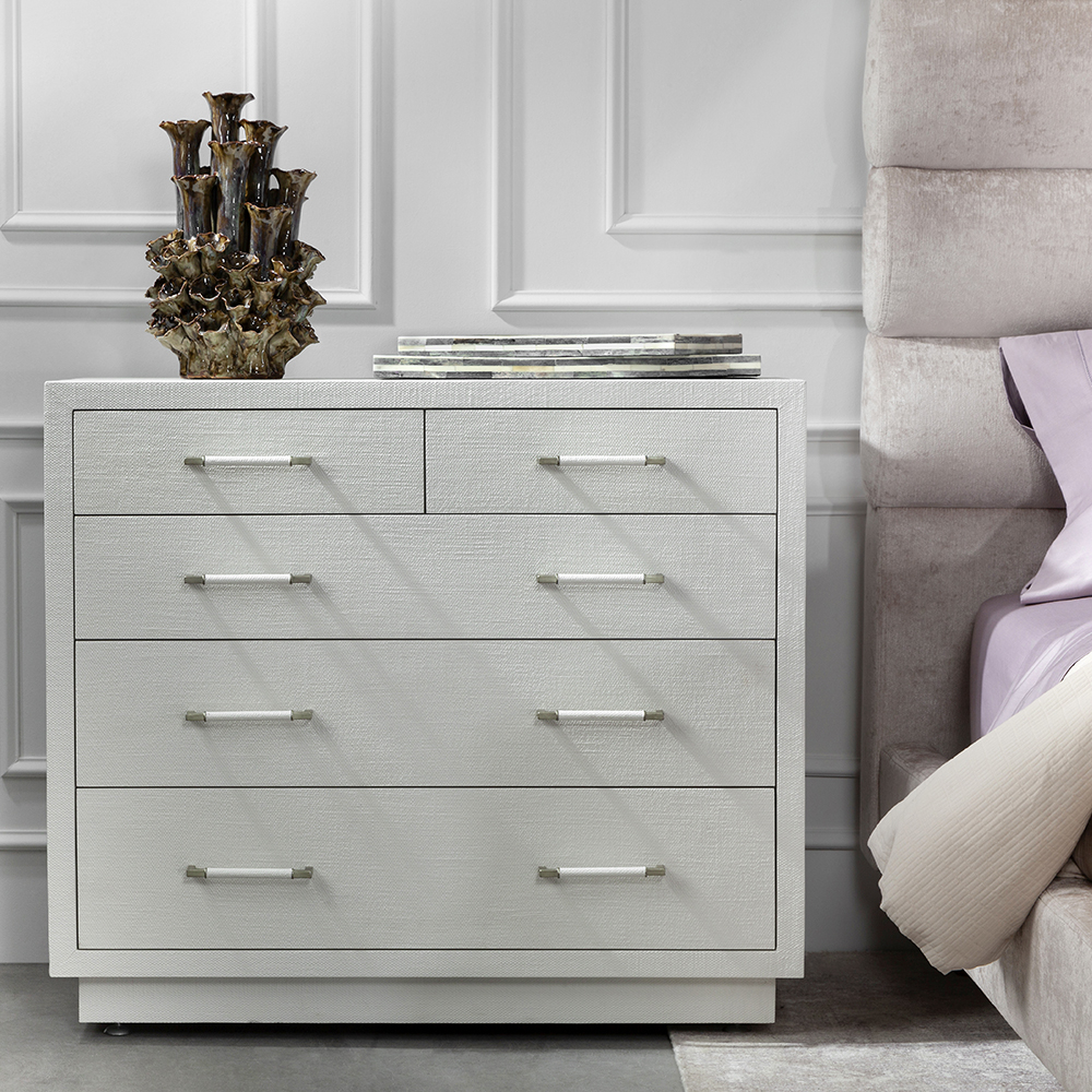 The clean lines of the Taylor 5 Drawer Chest are transformed into a statement piece thanks to the texture of light natural white faux linen and metal pulls in champagne silver.