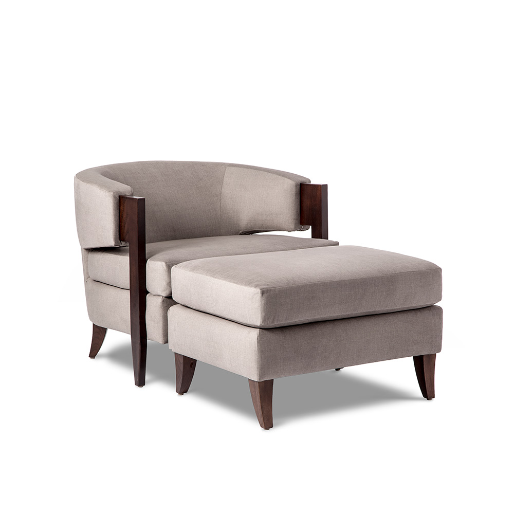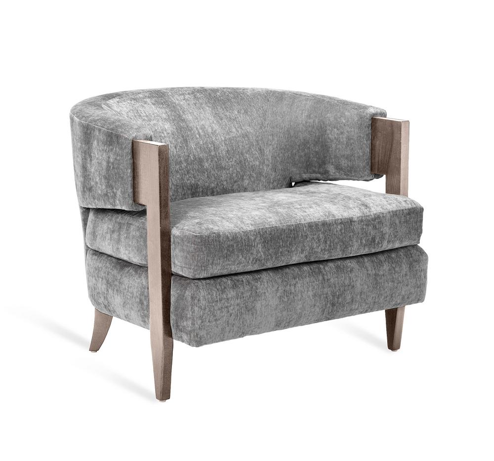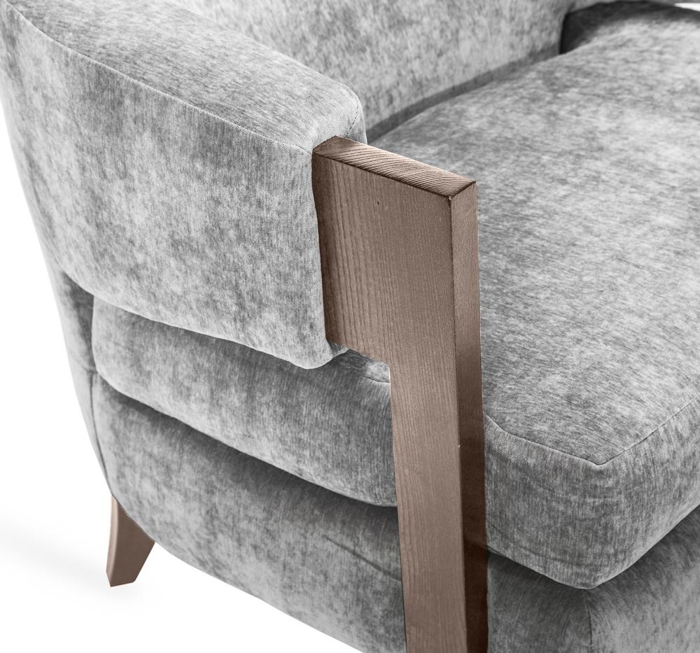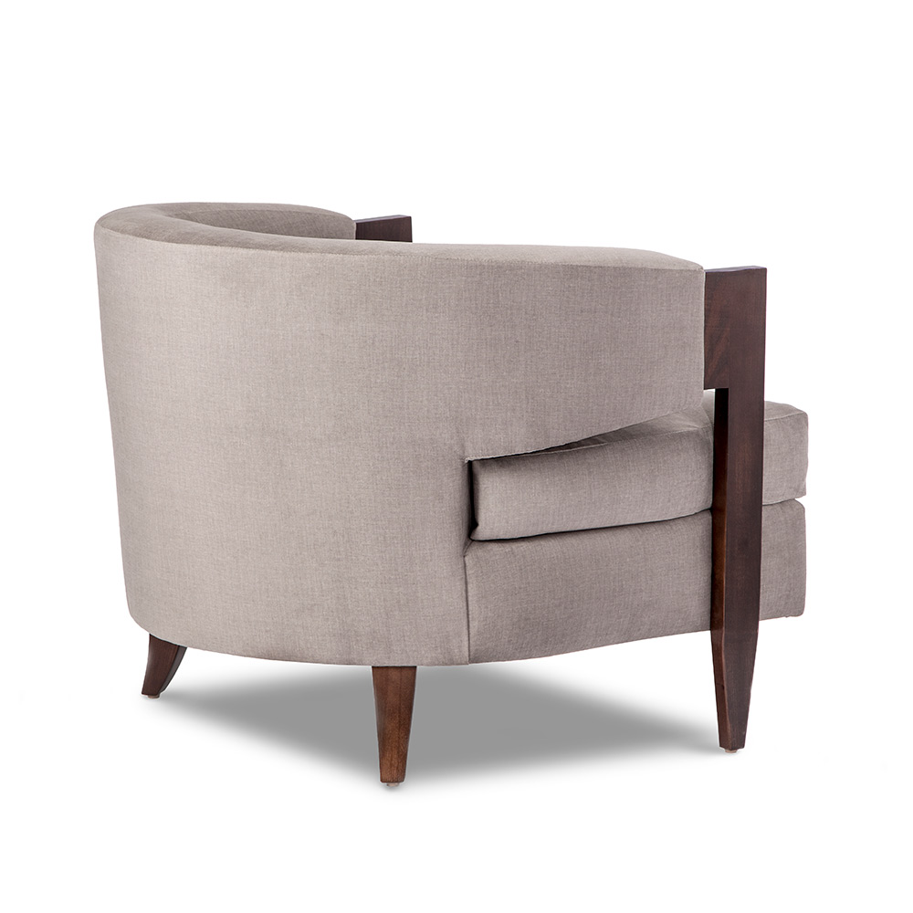 Solid wood legs add natural warmth to the curved-back Kelsey Grand Chair. All hardwood frame with interlocking construction. Advanced unidirectional web seating suspension. Loose seat cushion and tight back with premium polyurethane foam and 100% polyester fiber. Choice of finish on wood arms and legs. Available in Interlude Home Custom Upholstery fabrics, COM, or COL.