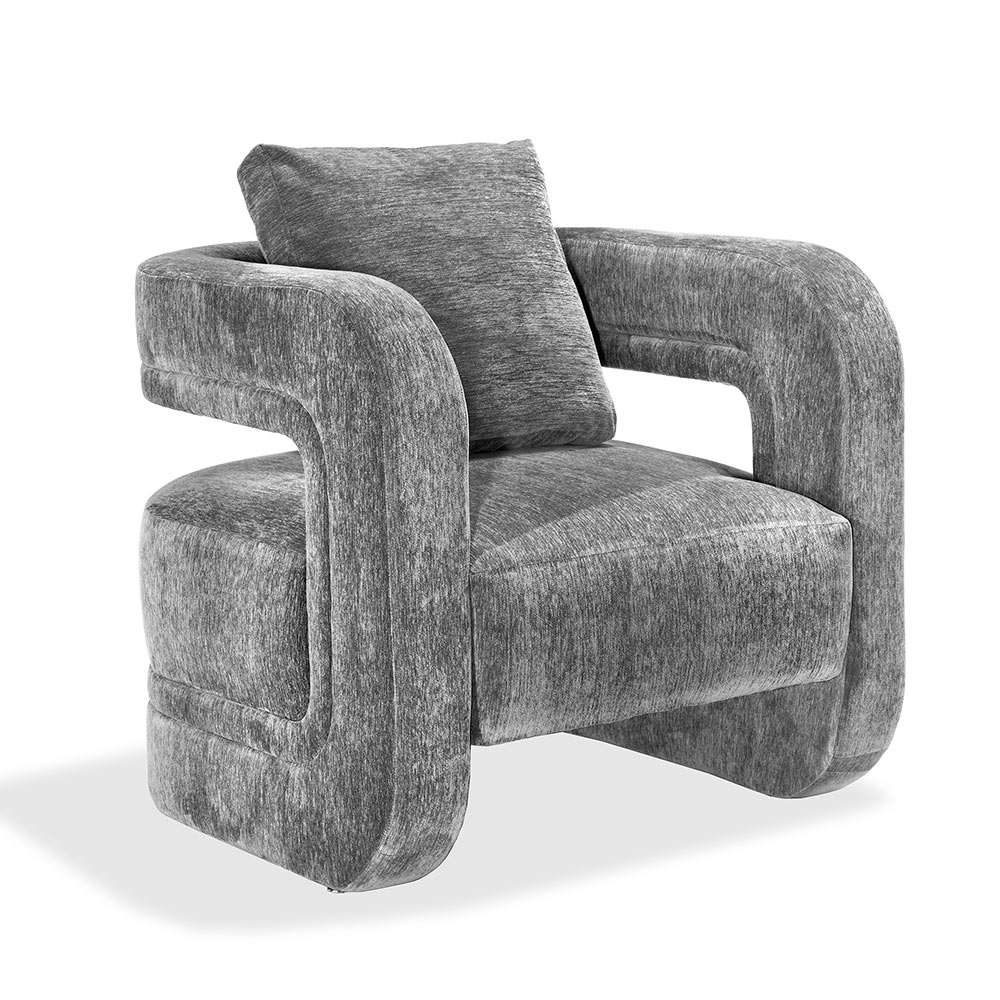 Conversation-sparking, the Scillia Chair commands attention. All hardwood frame with interlocking construction. Advanced unidirectional web seating suspension. Loose seat and back cushions with premium polyurethane foam and 100% polyester fiber. Available in Interlude Home Custom Upholstery fabrics, COM, or COL.